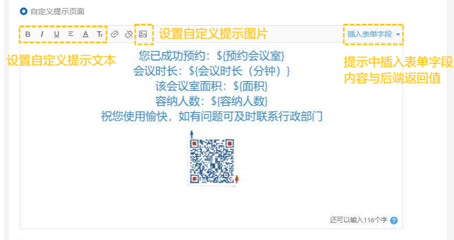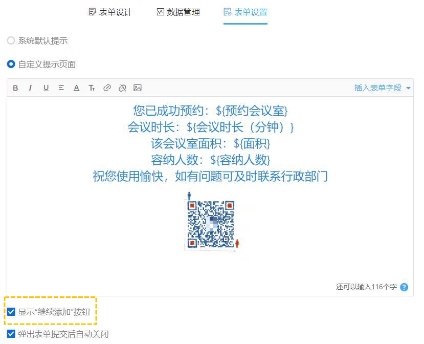 我们以会议室预约场景为例,如填写者通过表单外链预约会议室成功后,我们可以通过自定义提交设置,提示填写者预约已成功,并让他再次确认相关信息。