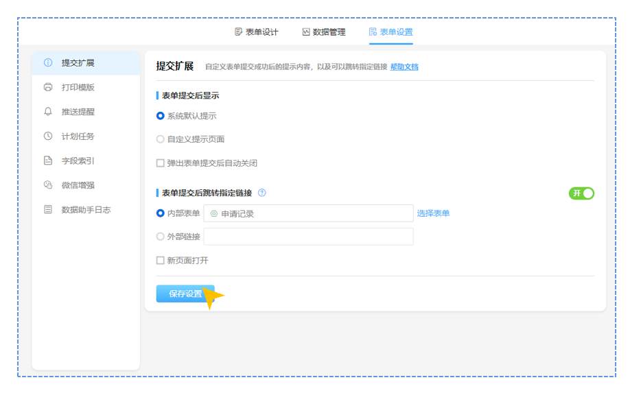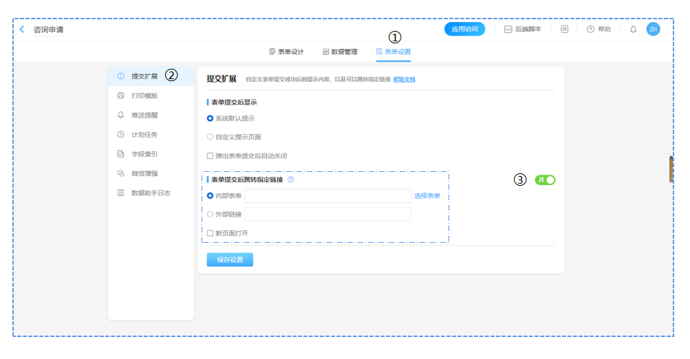 我们进入到需要设置跳转的表单管理页面,这里我们选择咨询申请表单。找到表单设置中的提交扩展,开启跳转指定链接的按钮,我们就可以进行跳转设置。
