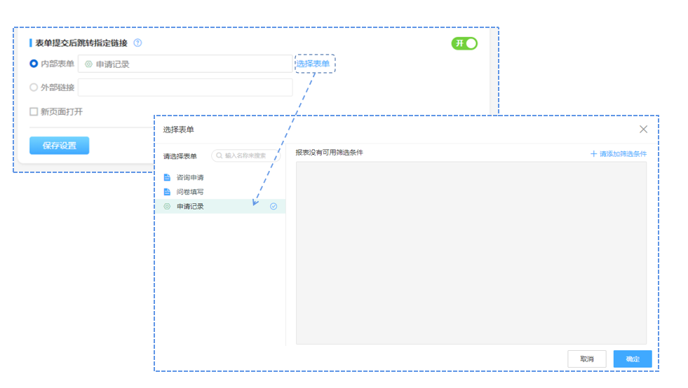 跳转有内部表单和外部链接两种,跳转内部表单支持当前应用内的表单和跨应用的表单。这里我们需要跳转到申请记录,只需要在选择表单的列表左侧勾选问卷表单即可。