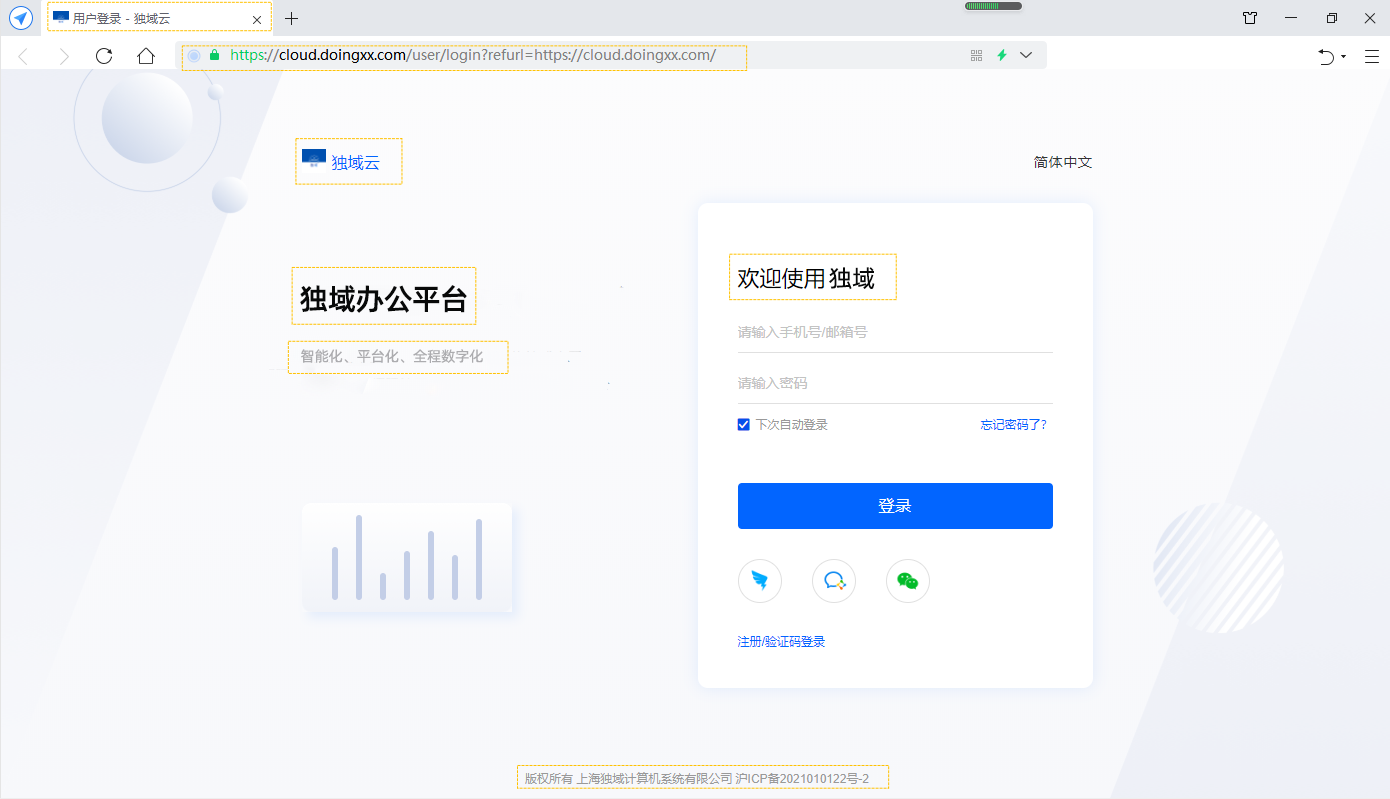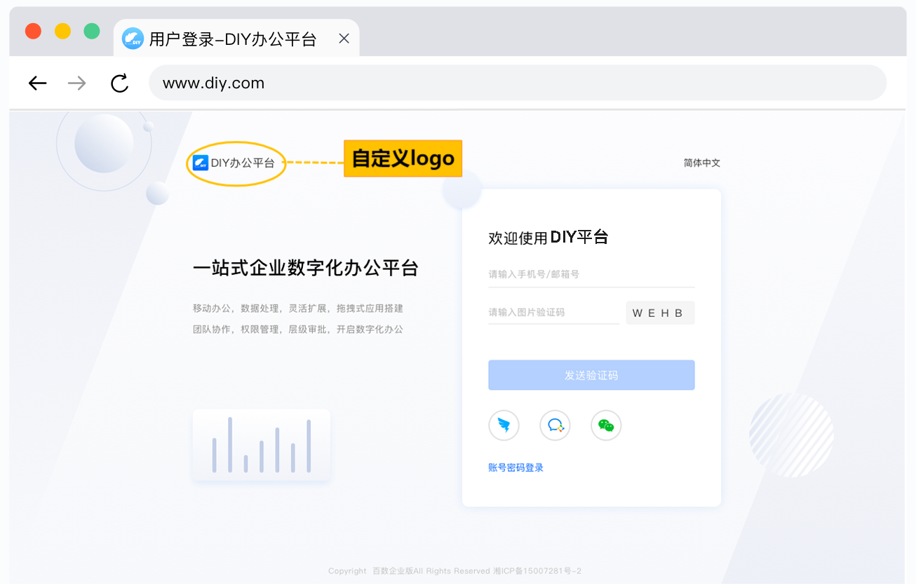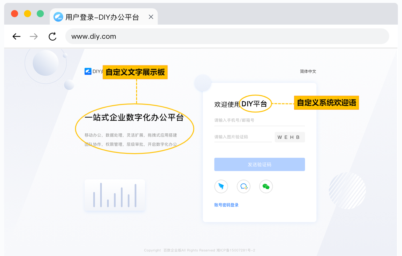 支持用户自由设计登录注册界面的文字展示板:[用户可在此处填入企业文化/企业通知..]以及系统欢迎语:[用户可在此处填入企业名称/slogan..],满足用户行业多样性与自由度;也可以根据需求,自主设置展示/隐藏文字展示版。