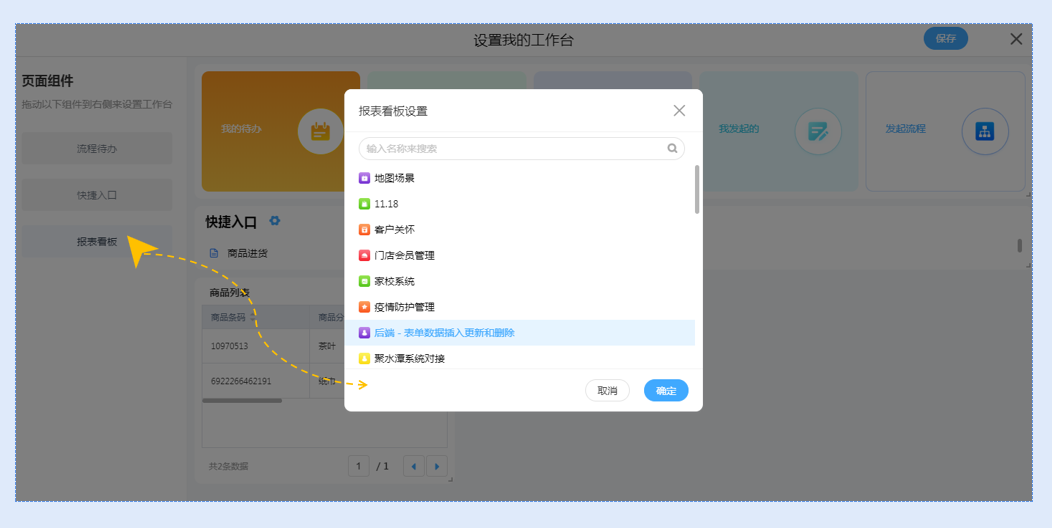 在自定义工作台还能设置报表看板,可以将常用的图标设置在看板位置,以全局视角查看表单报表内容。