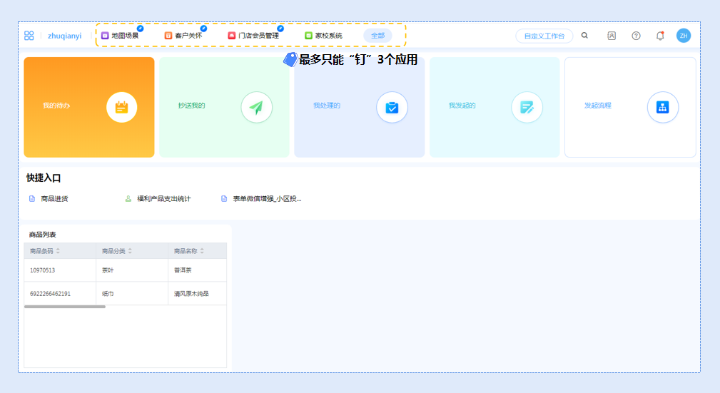 工作台上方的导航栏用于放置常用应用,点击【全部】可以展开所有的应用。