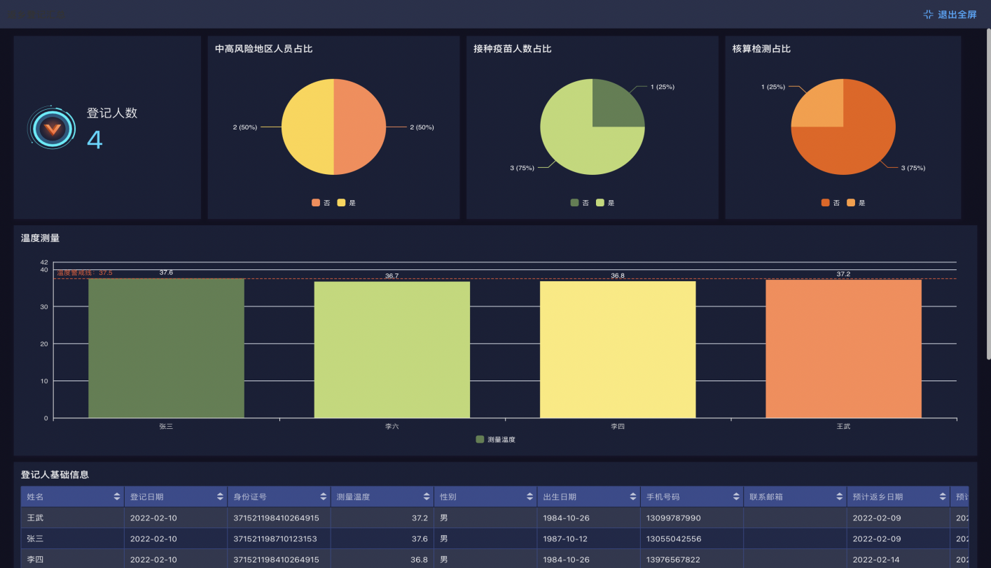 报表展示每日返乡人员的数量及所属区域,接种疫苗人数及核酸检测人员占比,通过快速筛查,准确找到对应人员的全部信息。