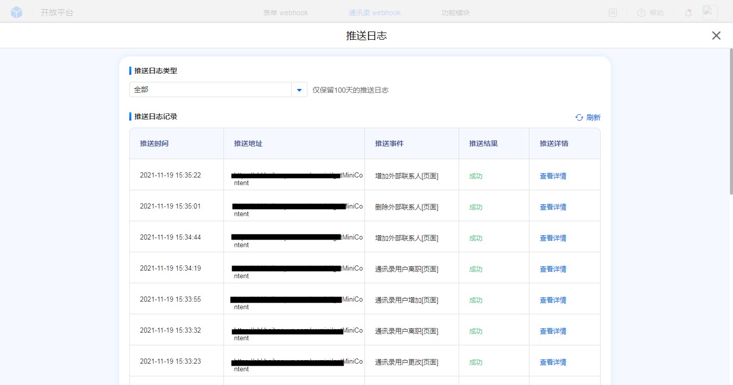 推送日志里记录了每条推送记录的时间、地址、事件、结果、推送详情。