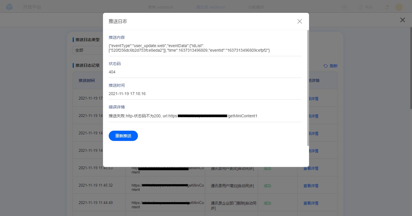 • 推送详情中可以查看到推送内容、状态码、推送时间、错误详情等信息,如果事件推送错误了还以在此处查看到具体信息。
