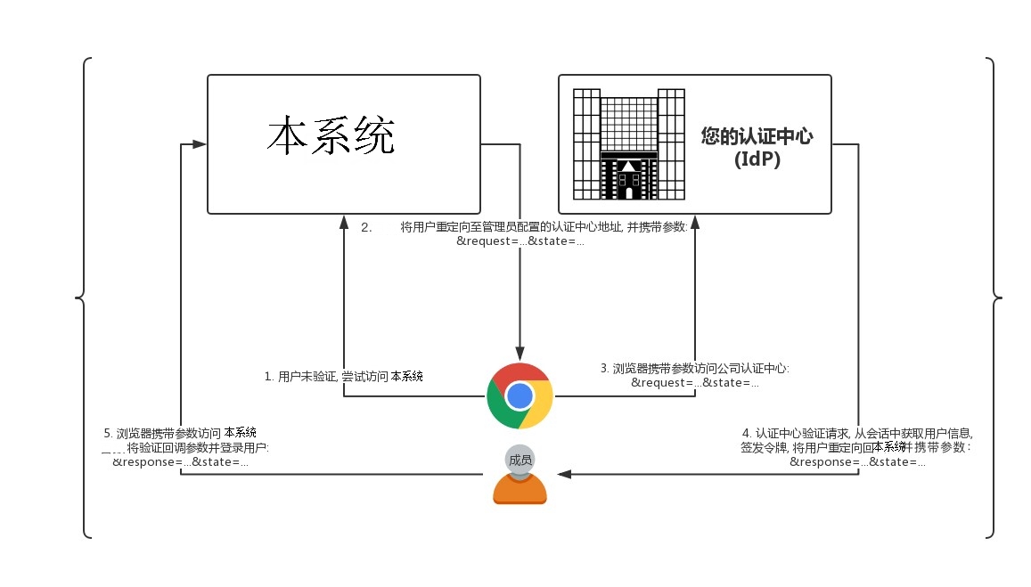 基于配置的 IdP 信息, 客户需要开发自己的 IdP来与本系统对接以实现单点登录. 用户 IdP 的作用可从下图中体现: 即 IdP 服务: