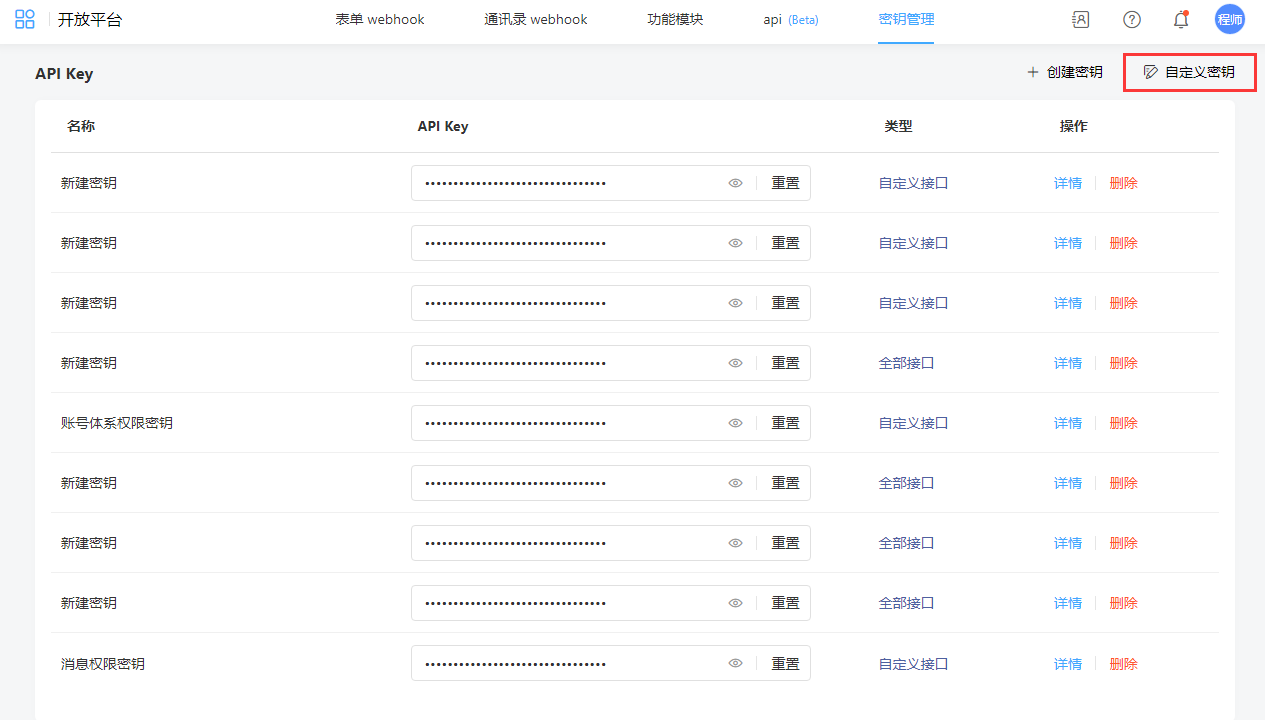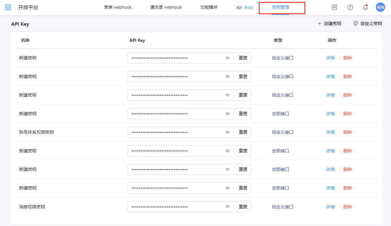 1、登录上面赠送的账号到私有云https://私有云域名/应用主页工作台,点击右上方个人头像,选择开放平台后,可看到密钥管理界面。