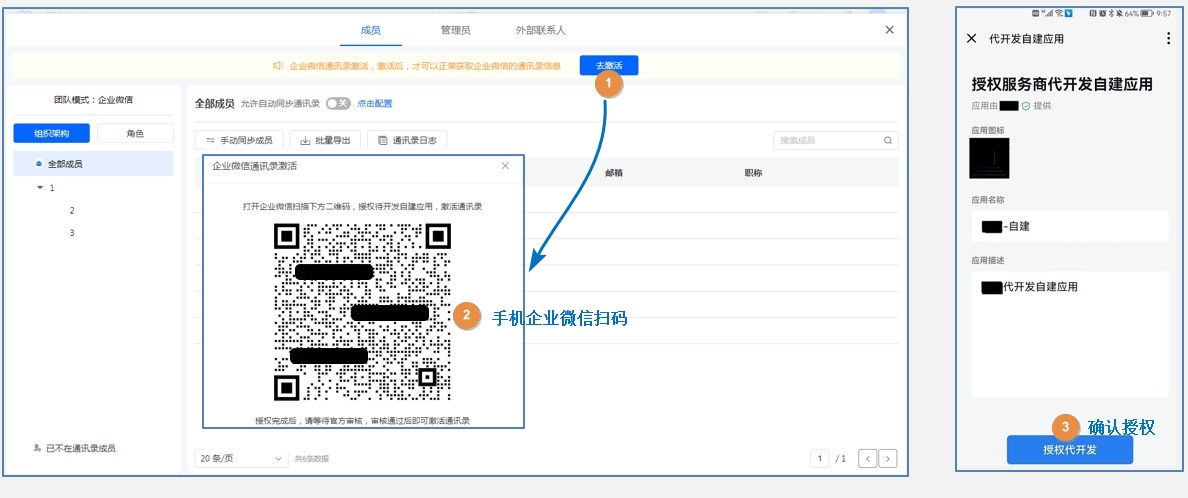 1、企业微信三方团队创建者在 [系统] - [通讯录] 点击 [激活通讯录],扫描二维码授权代开发应用。