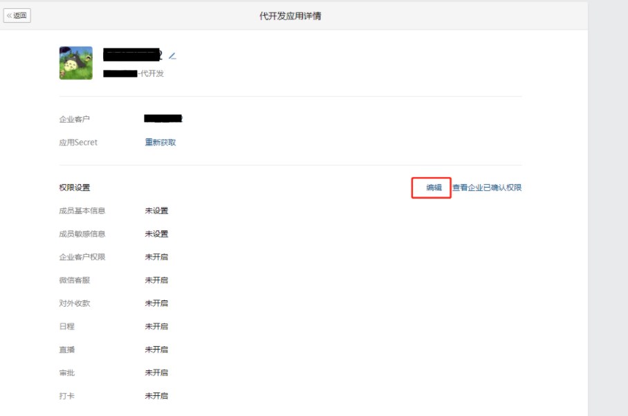 1) 进入企业微信服务商后台,代开发应用详情页,权限设置模块,点击右上角“编辑”按钮,可进行代开发应用自定义权限编辑。