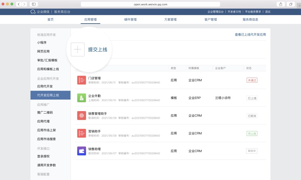 1) 进入 [企业微信服务商后台] - [应用管理] - [代开发应用上线],点击 [提交上线] 按钮,选择需要上线的代开发模版,和对应的企业代开发应用,提交上线审核。