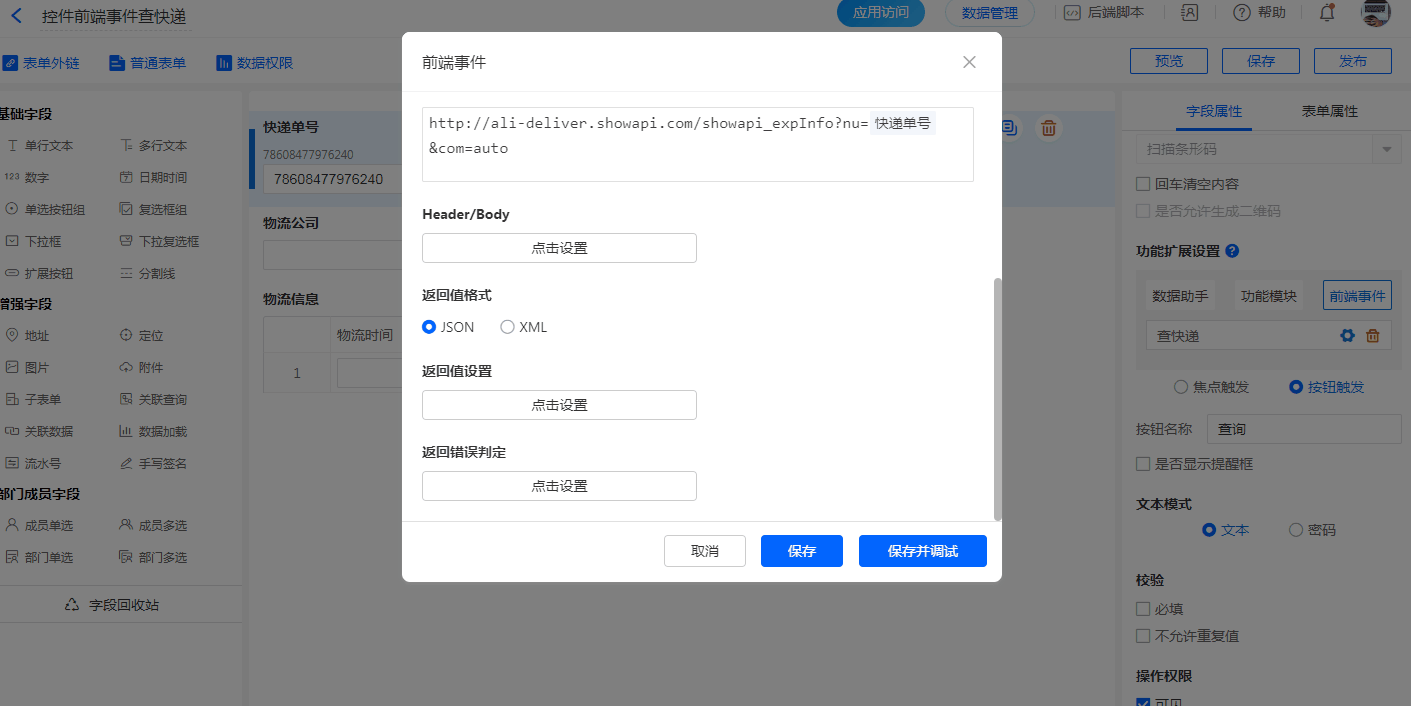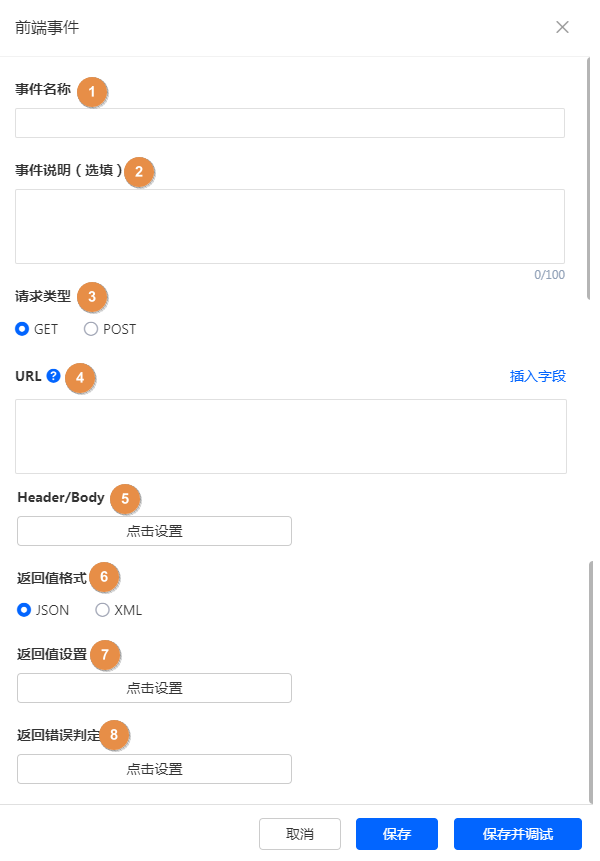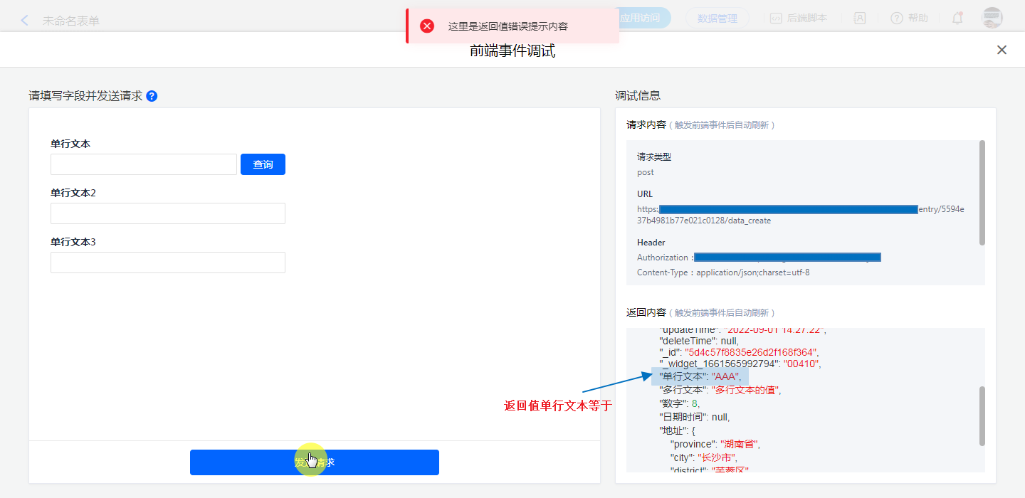 在设置过程中或者设置完前端事件后,均可以对该事件进行调试;点击发送请求将会触发接口调试,将返回内容展示出来。