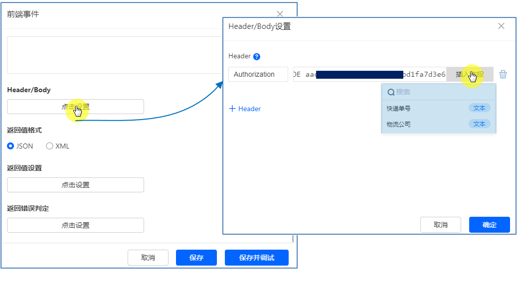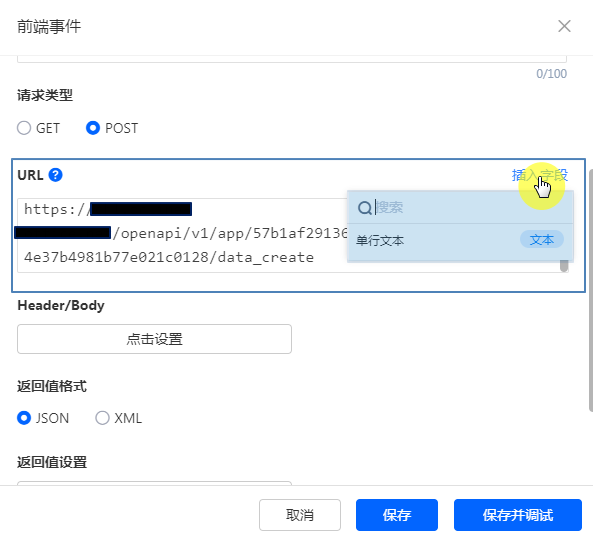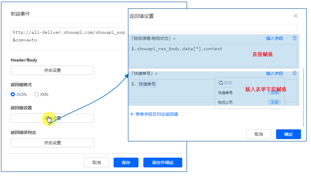 对返回值字段中配置赋值规则,可以直接赋值,也可以插入表单中的字段进行赋值: