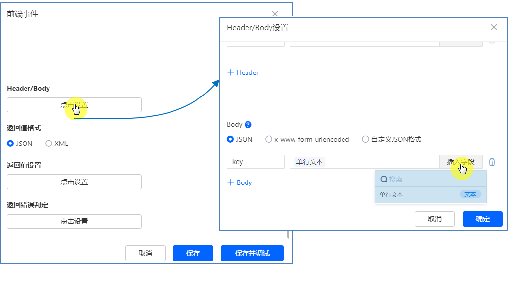 • 当请求类型为「POST」时,支持设置 Header 和 Body 参数。