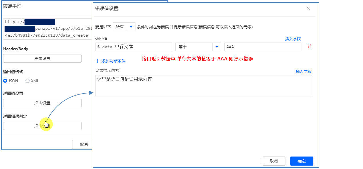 自定义返回错误,设置条件后,发送接口请求,当接口返回数据满足条件,则提示错误,中断执行[返回值设置],接口的数据不会再填入本表单字段中。