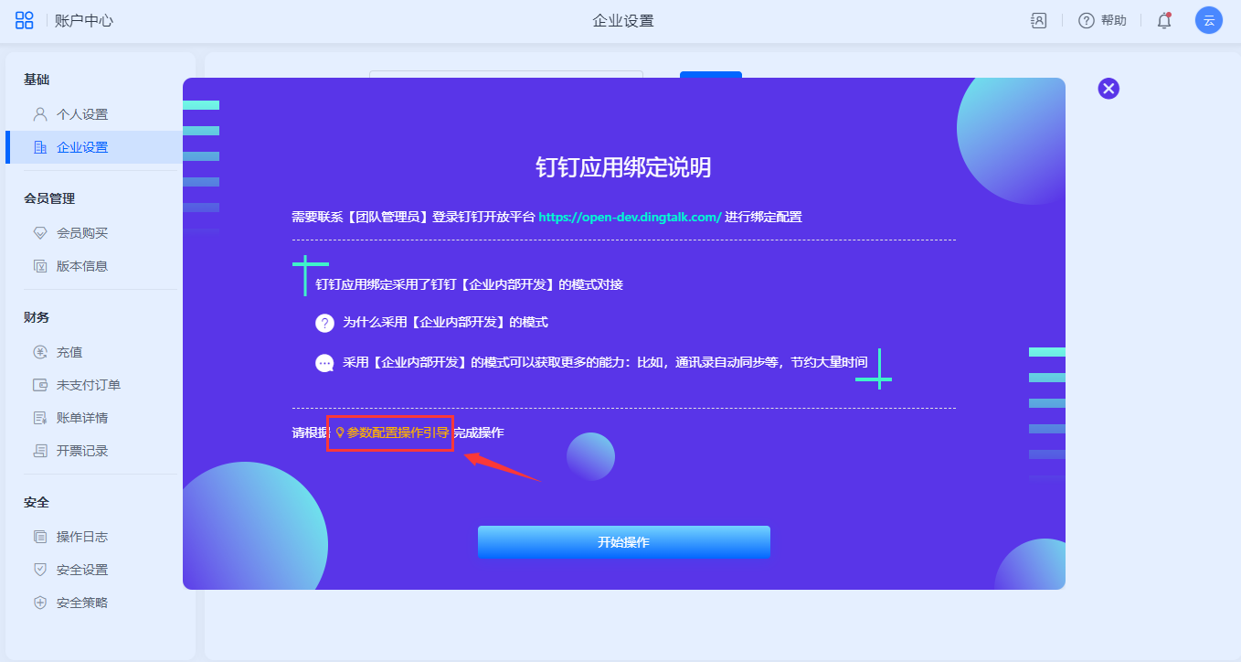 3、按照钉钉应用绑定说明里的参数配置操作引导完成绑定操作