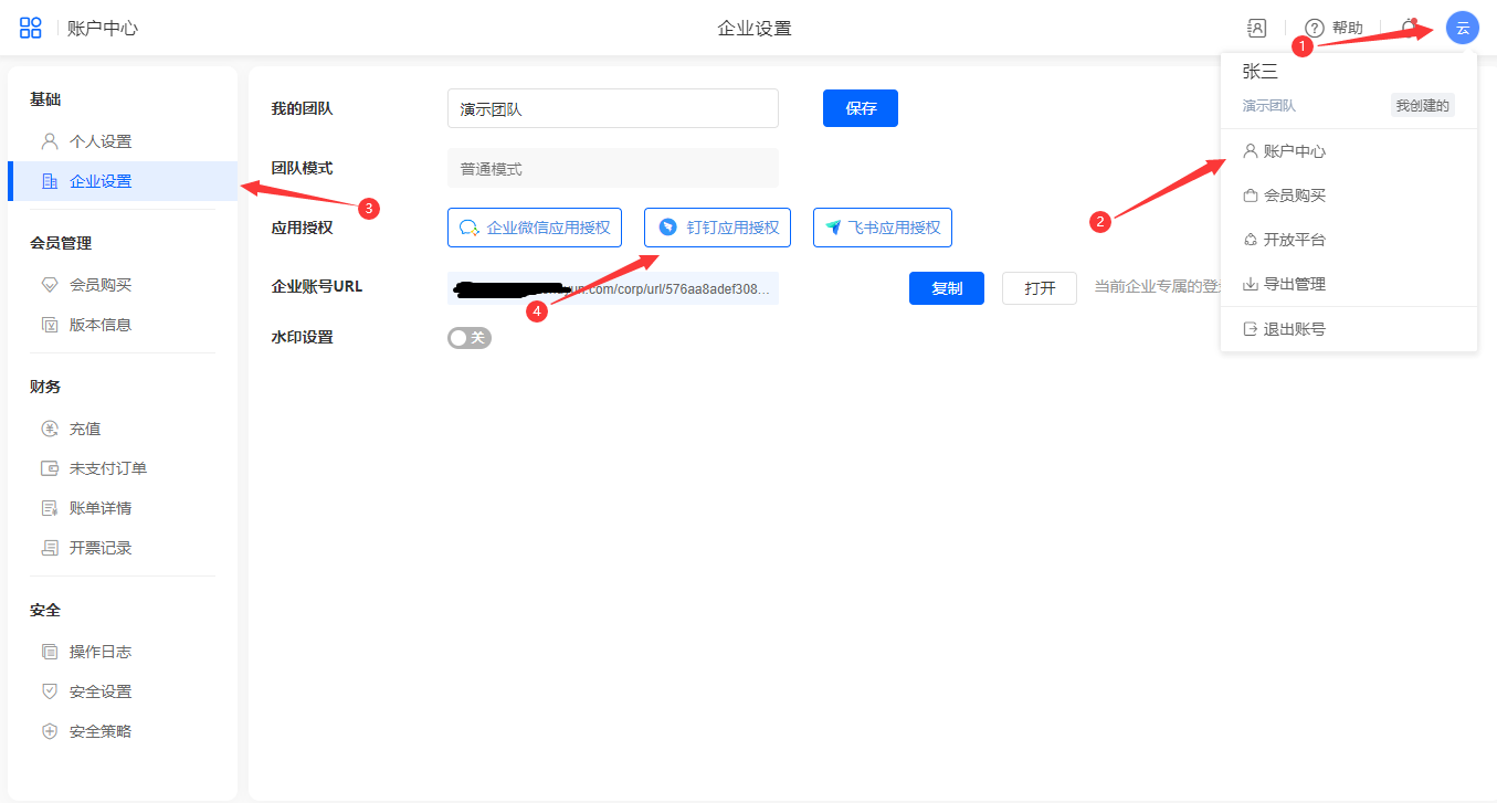 2、进入账户中心->企业设置选择钉钉应用授权。