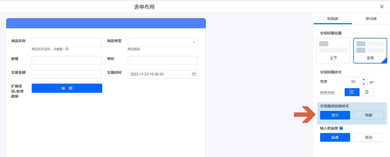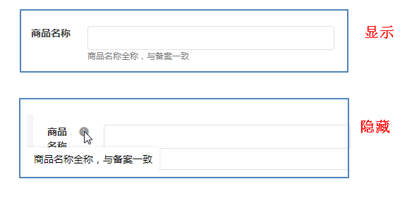 设置了 [显示] 后,描述信息将直接在输入框下方进行显示;设置 [隐藏] 后,描述信息将以小提示的方式展示,点击提示符号,将弹出对应的描述信息。