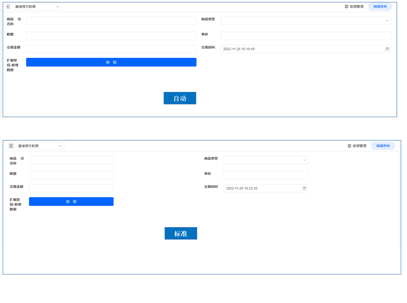 • 标准:无论表单界面是否变化,输入框显示字段正常使用够用的宽度。
