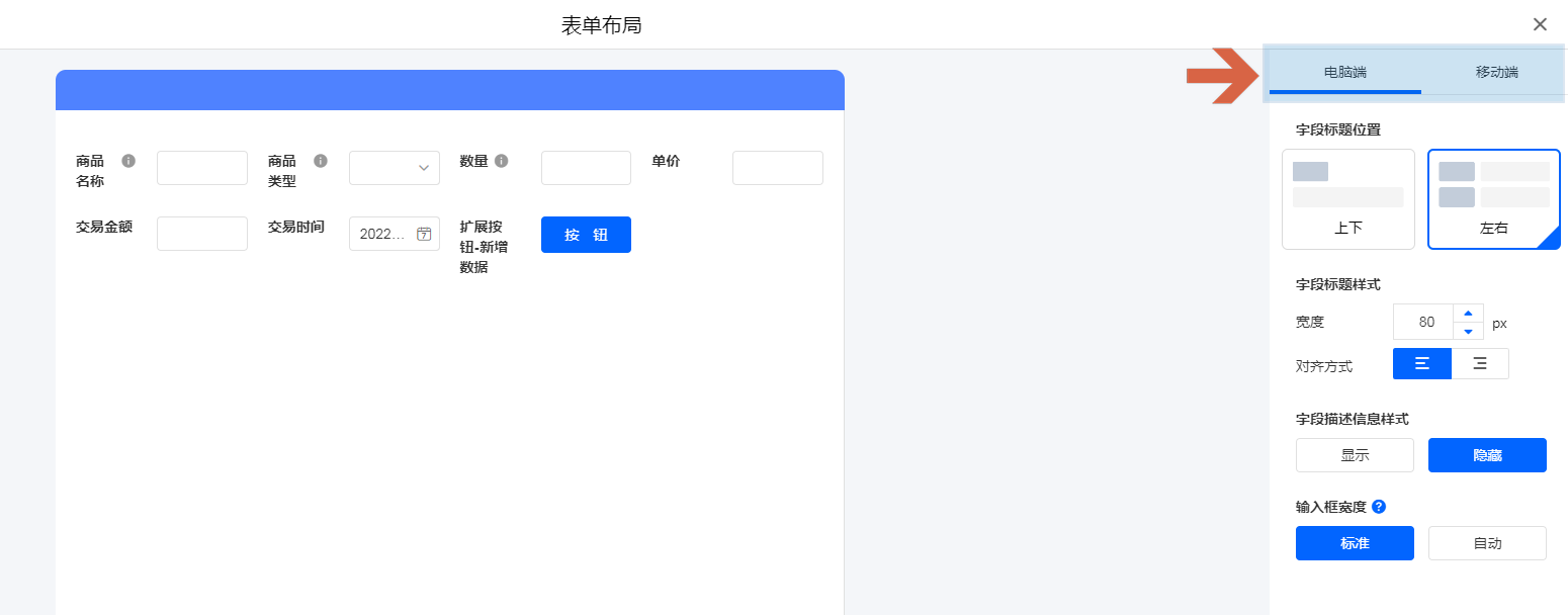 在更多设置里可以对字段标题位置、输入框宽度等进行更个性化的设置,支持对 [电脑端] 和 [移动端] 分别设置。