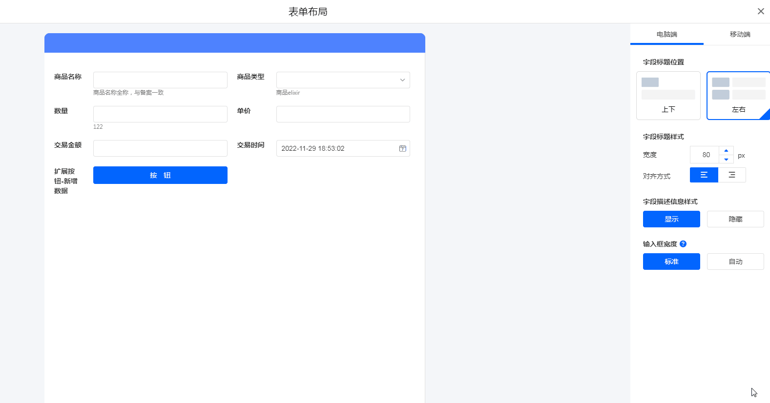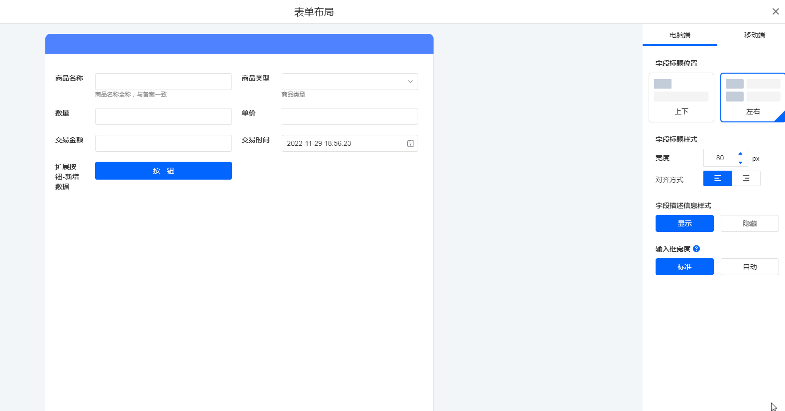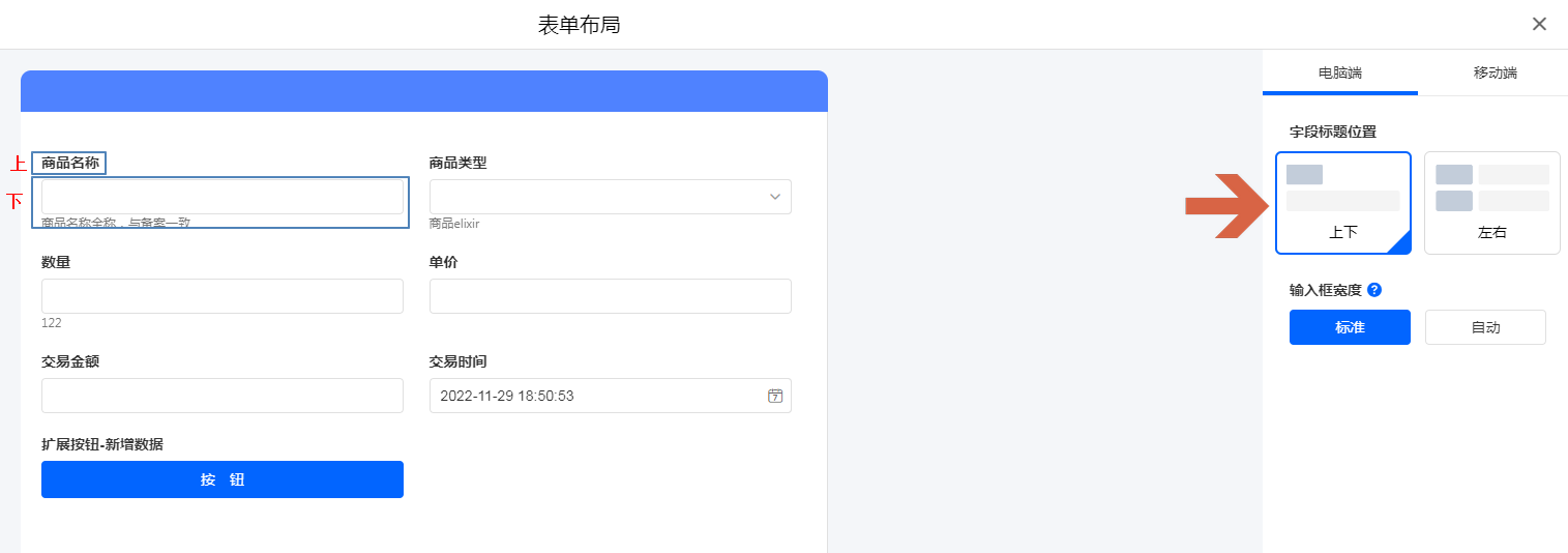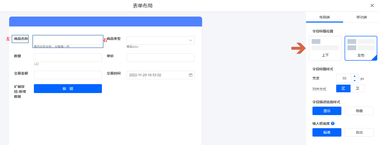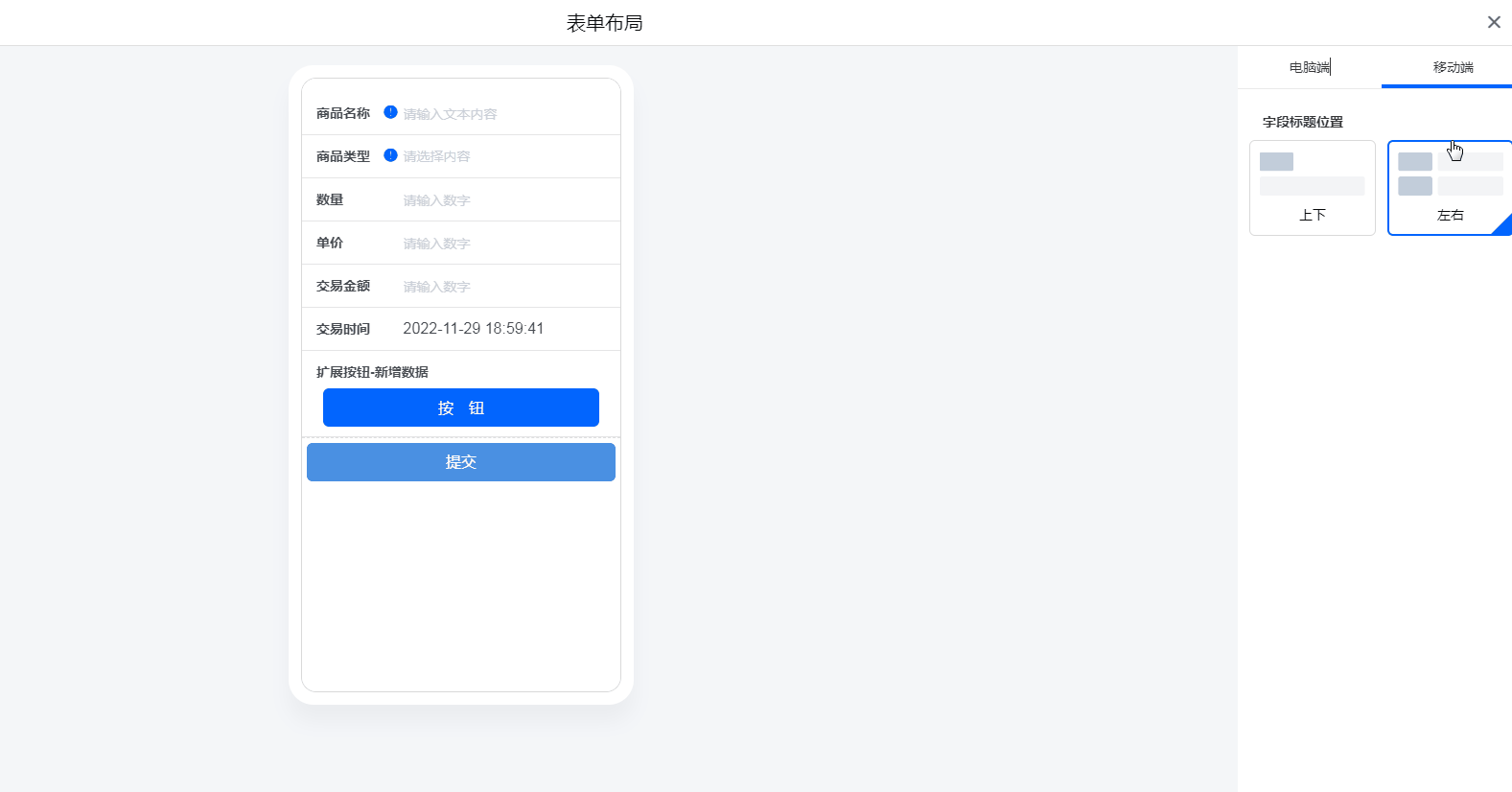移动端设置,字段标题可以设置为 [左右] 和 [上下] 两种位置布局方式。