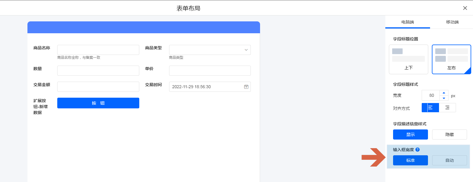 输入框宽度可以设置为 [标准] 和 [自动] 。