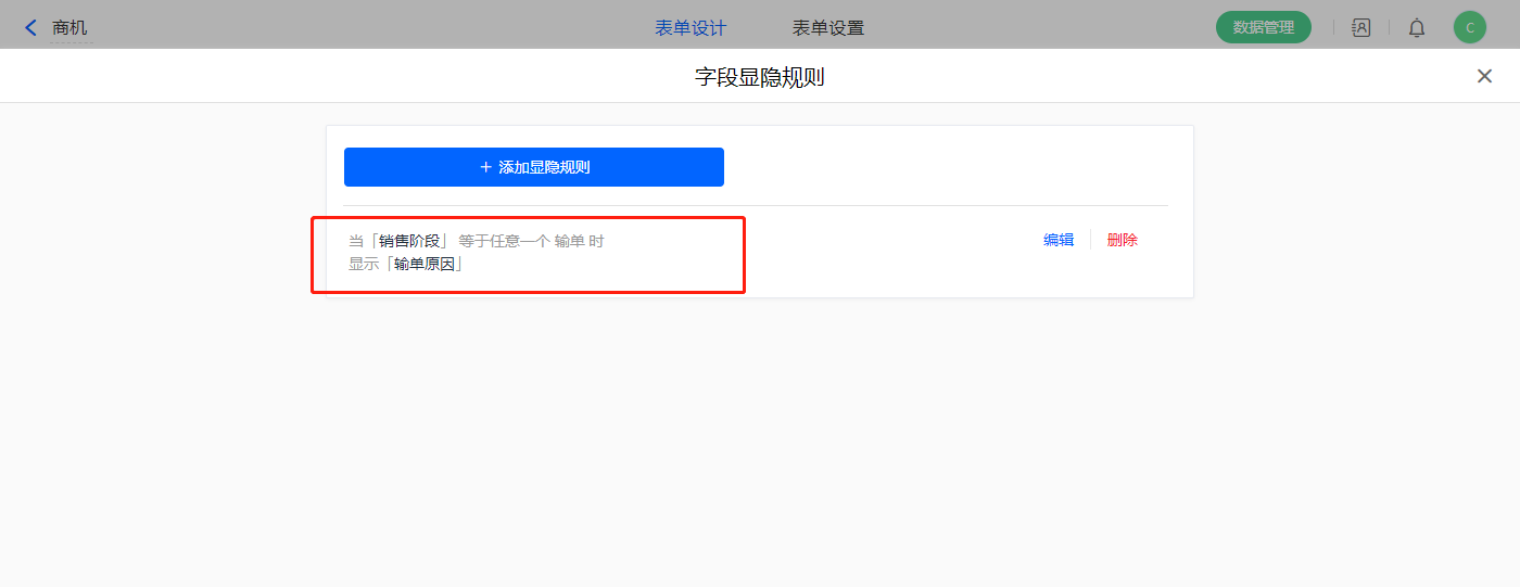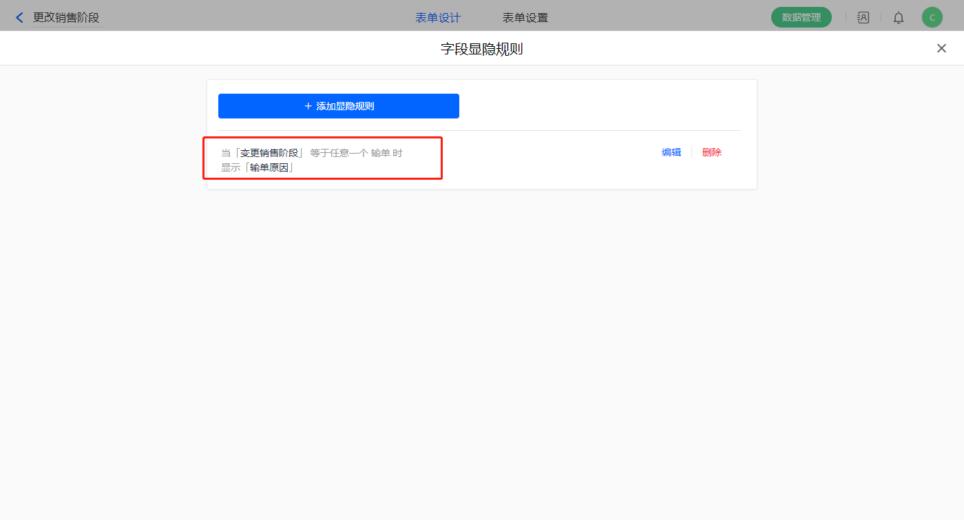 1)设置一条显隐规则,当【销售阶段】字段等于输单显示【输单原因】字段;