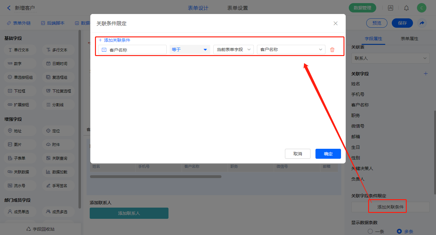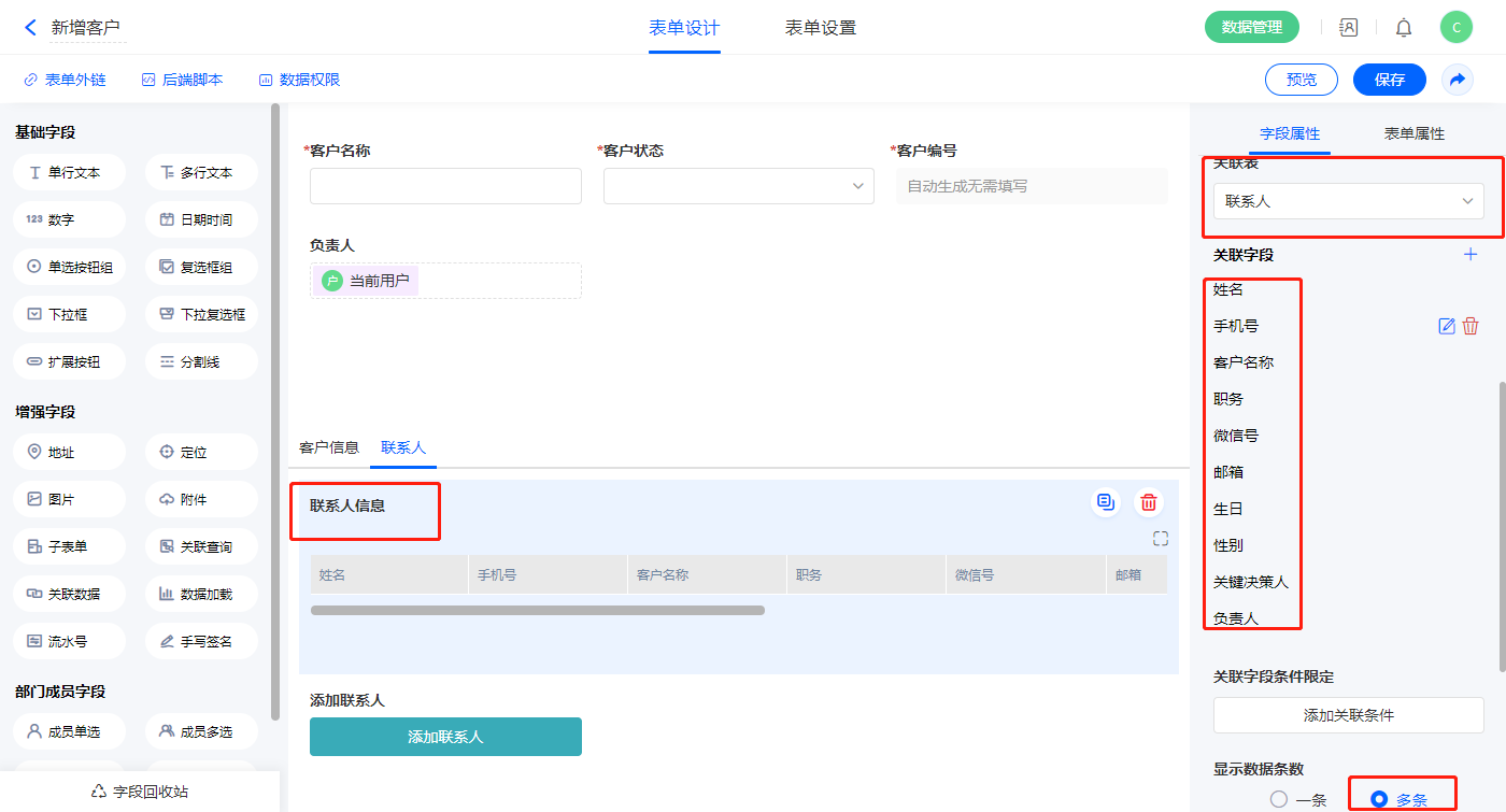 2)选择【联系人信息】关联查询字段,设置关联表为【联系人】并如图选择关联字段,设置显示数据条数为多条;