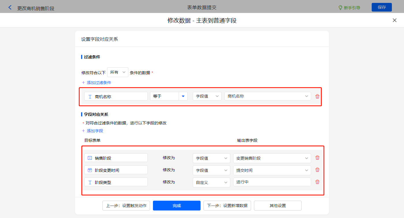 触发条件设置为当【变更销售阶段】字段等于【赢单】,则修改主表【销售阶段】、【阶段变更时间】、【阶段类型】三个字段的值;