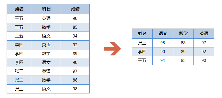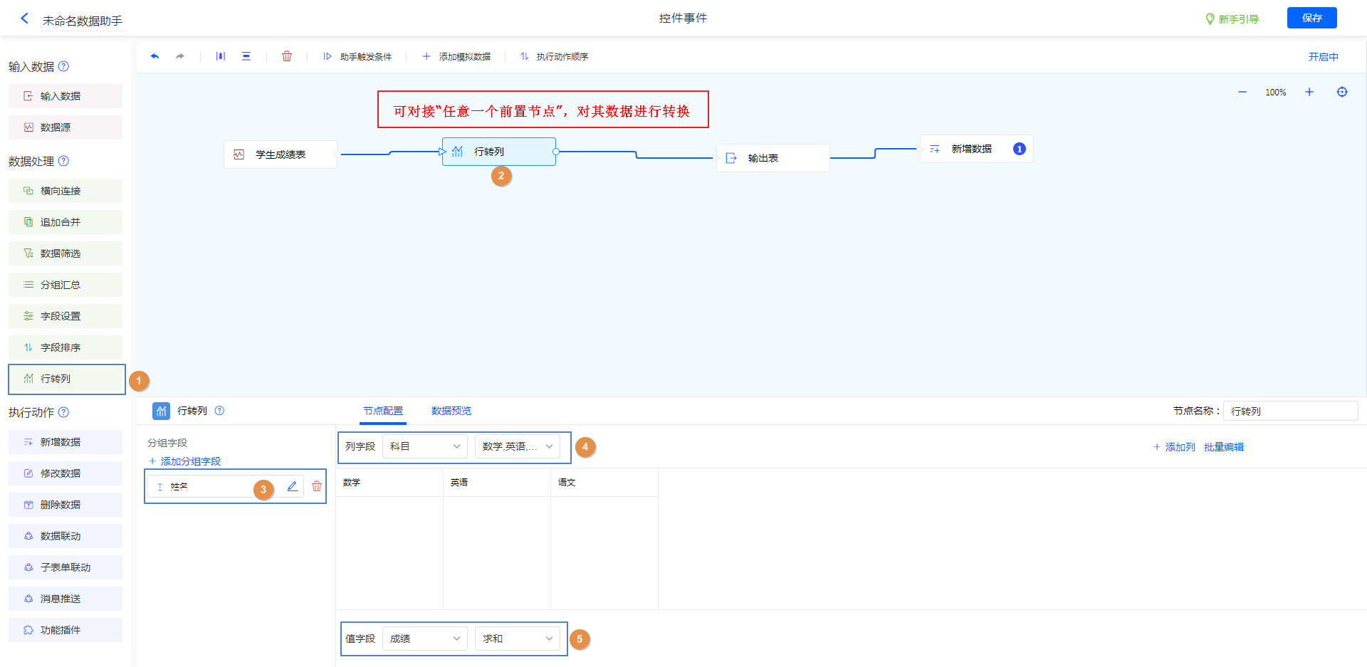 行转列:先根据设置的分组字段,把相同的值合并为一组;再根据设置的列字段、列和值字段,对分组后的数据进行计算并完成行数据到列表头的转换。实现一维表到二维表的转换。