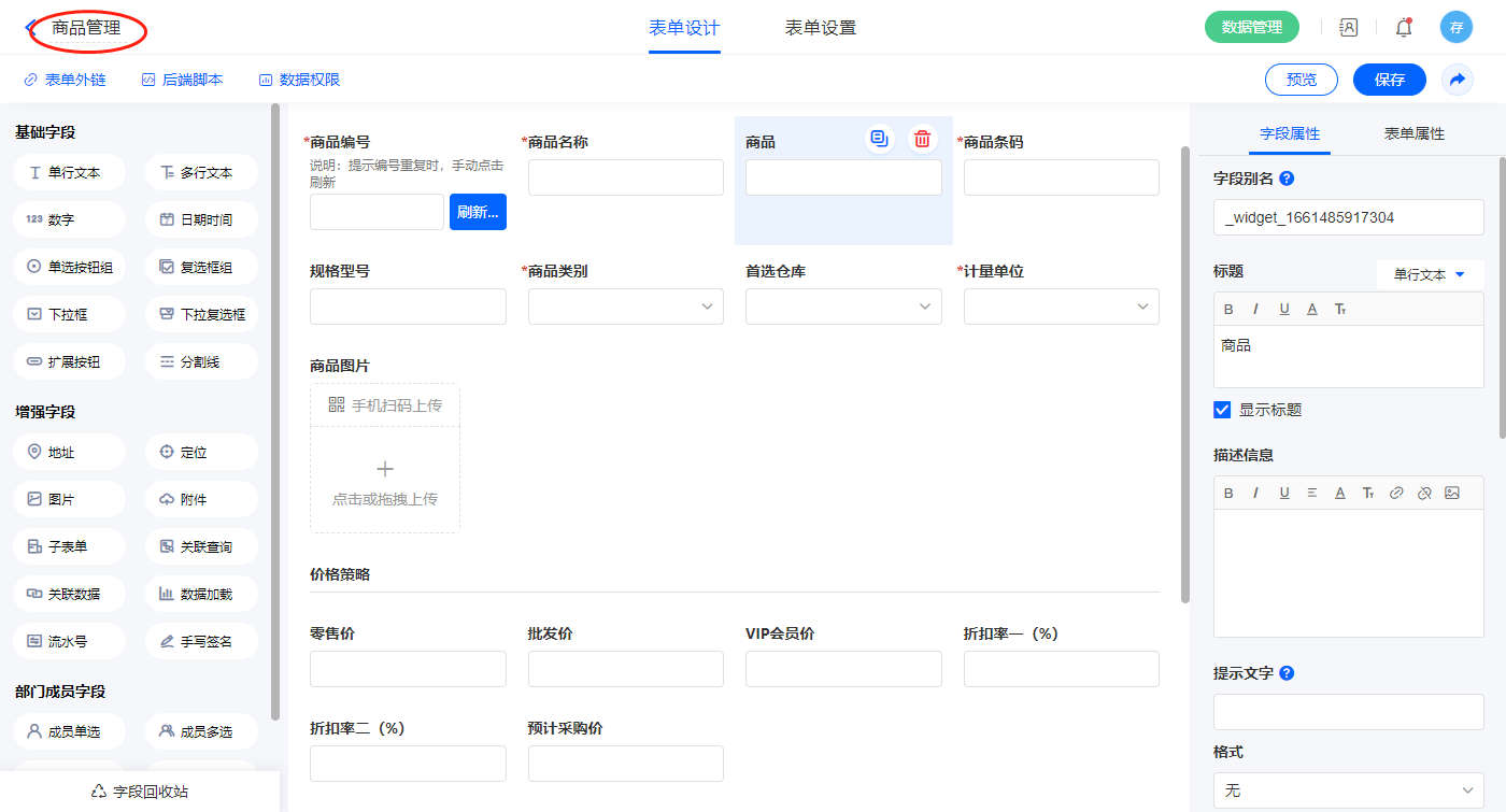 2.11、表单【商品管理】字段及表单属性设置
