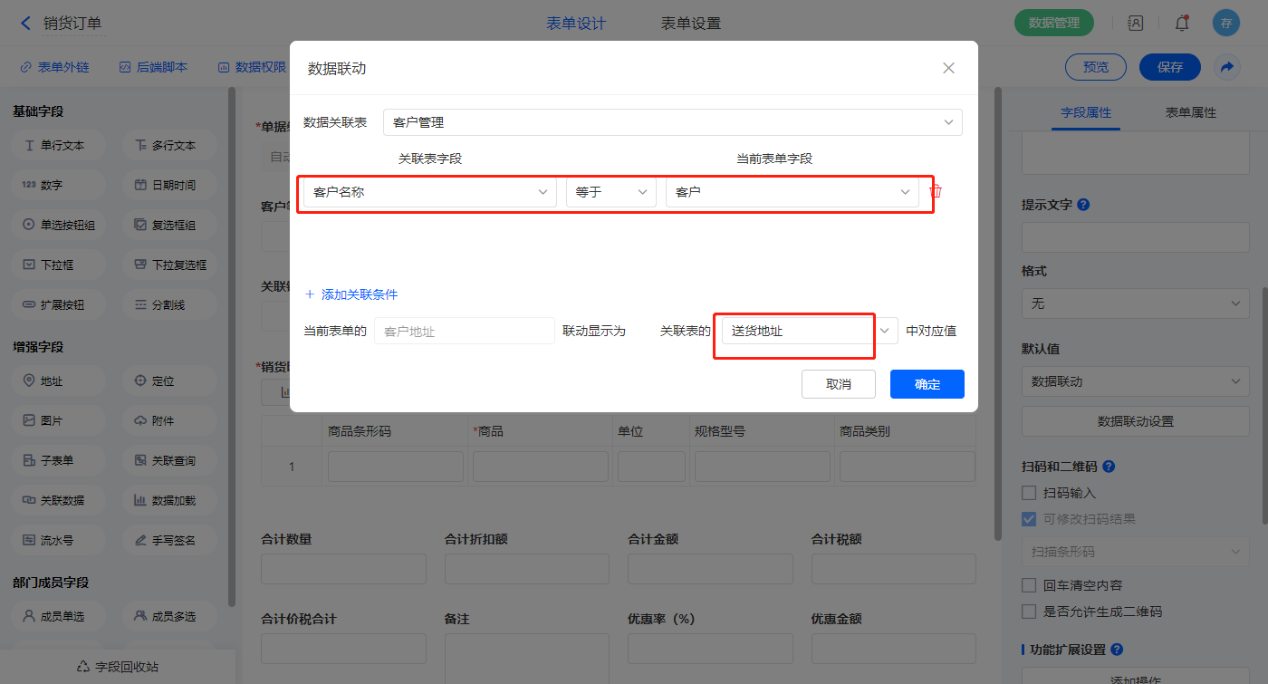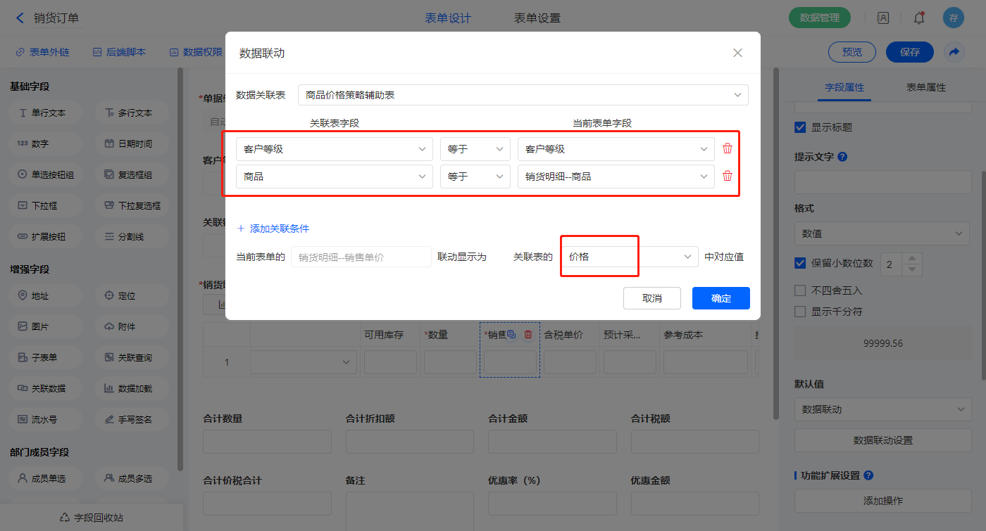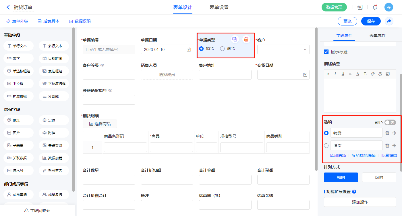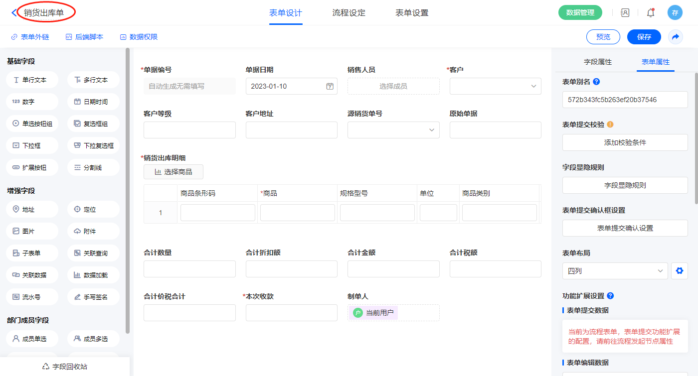 2.4、表单【销货单】字段及表单属性设置
