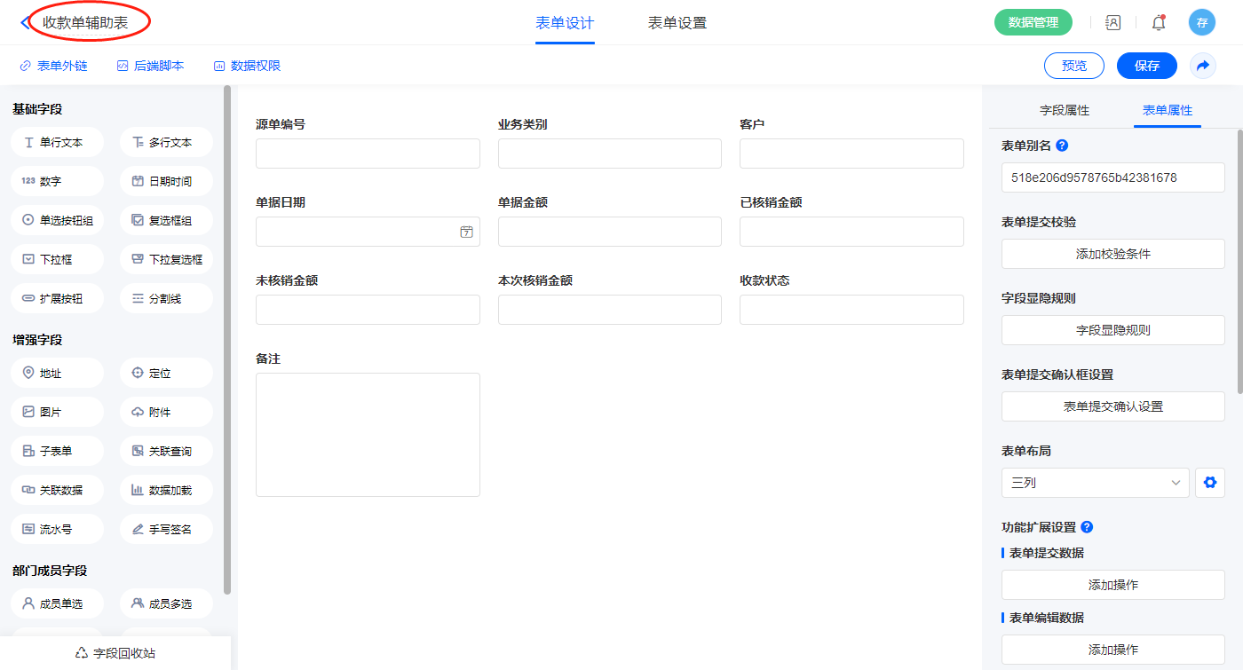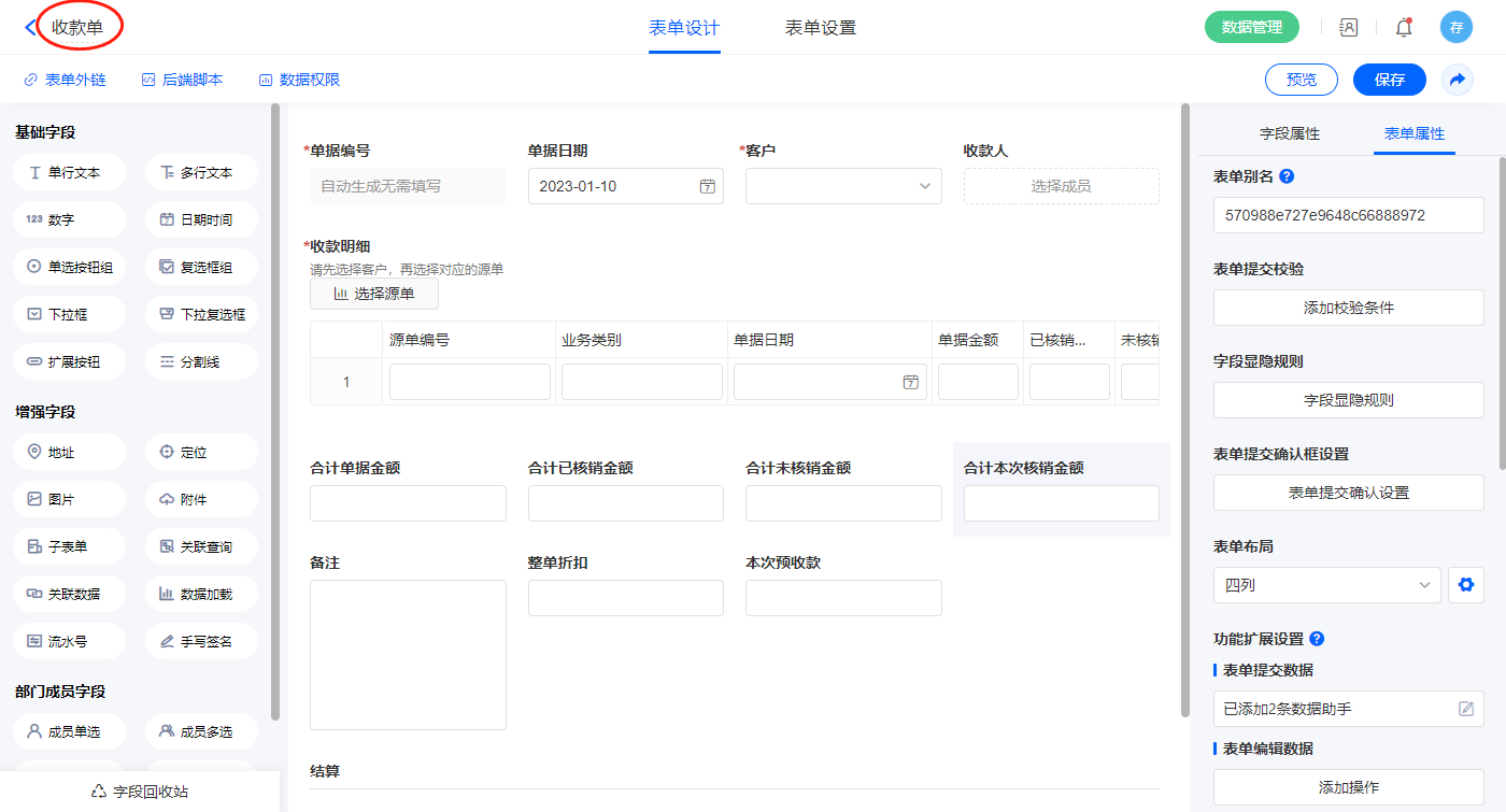 2.8、表单【收款单】字段及表单属性设置