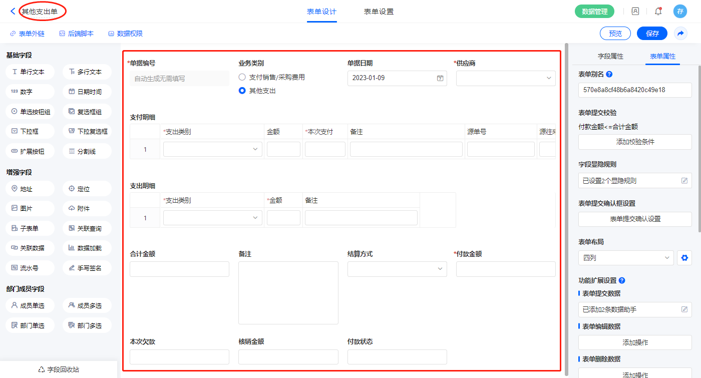 2.9、表单【其他支出单】字段及表单属性设置