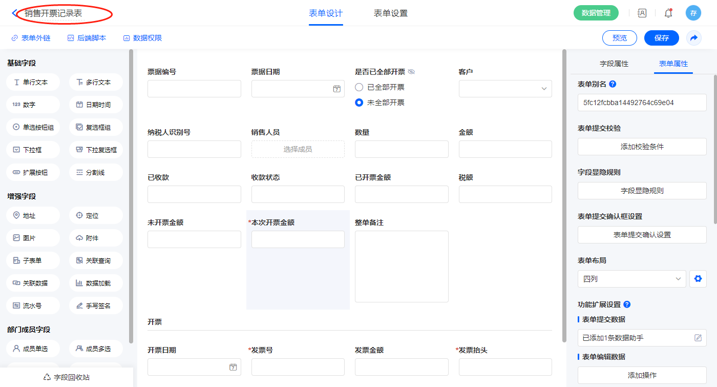 2.12、表单【销售开票记录表】字段及表单属性设置
