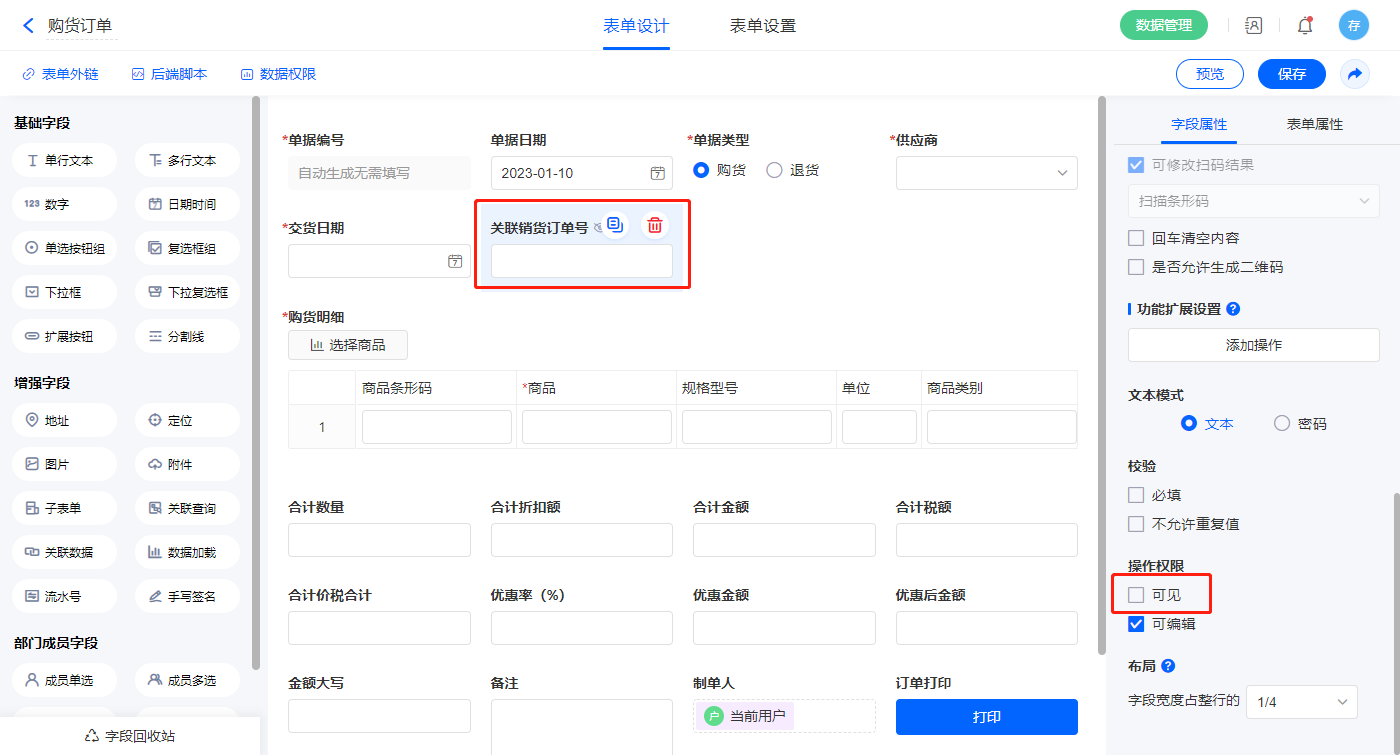 3)【整单折扣】、【本次预收款】两个字段设置不可见;