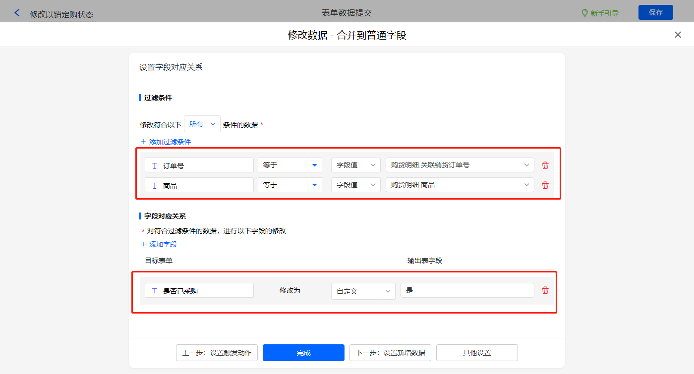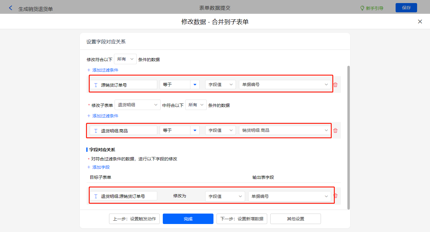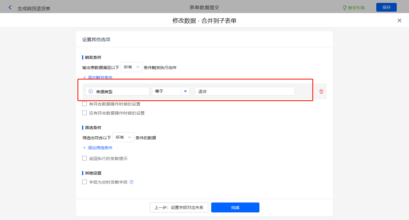 其他设置触发条件为【单据类型】字段等于退货,设置好点击【完成】并保存该数据助手;