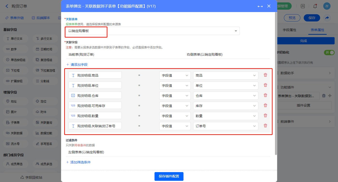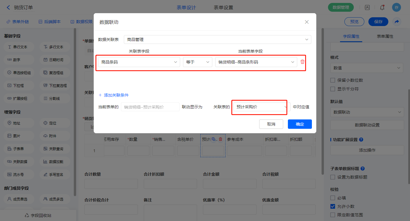 2)选择【源购货单号】字段,设置选项为其他表单数据,关联销货单的【单据编号】字段;