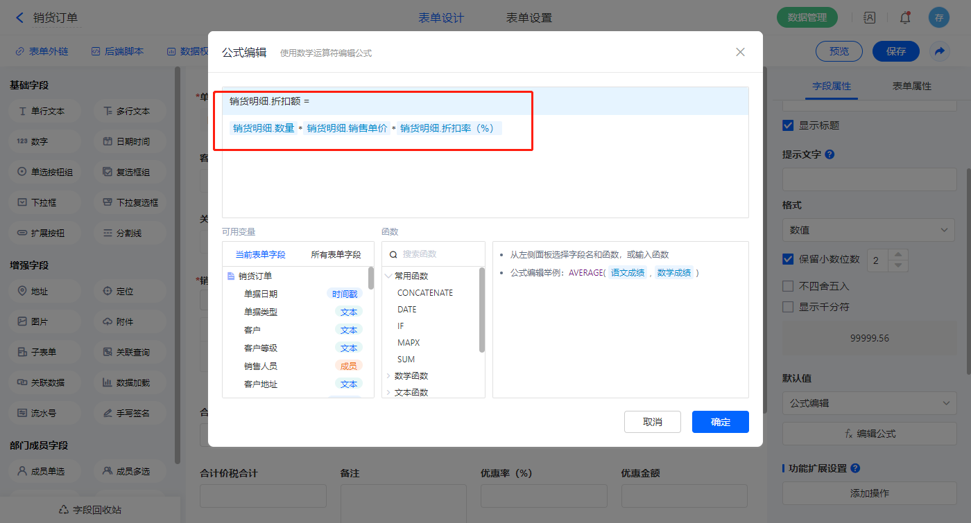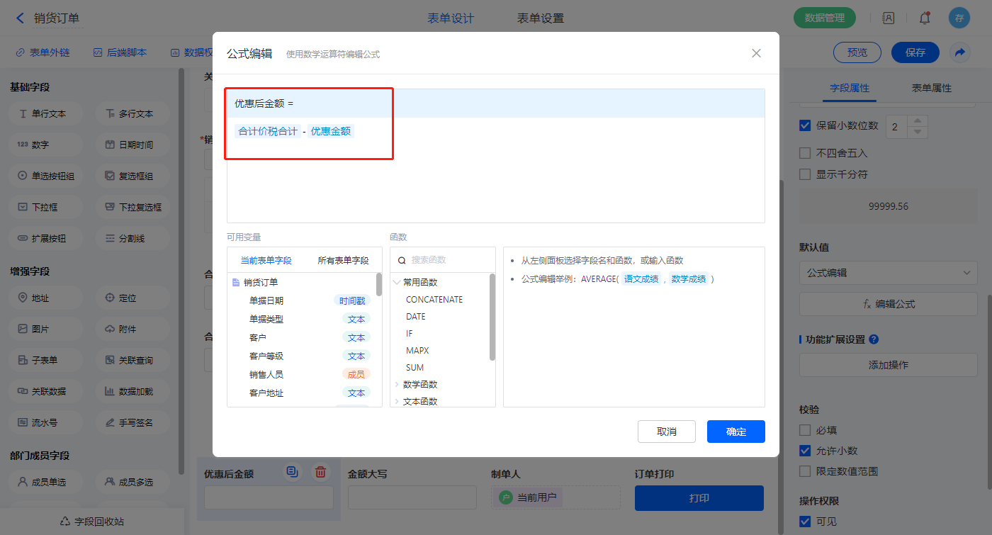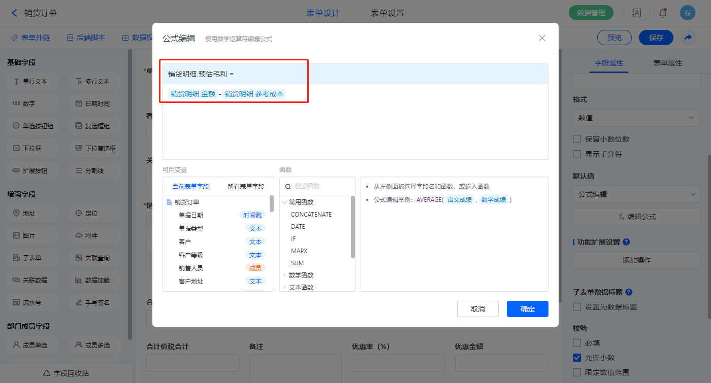 1)【销货明细.可用库存】、【销货明细.销售单价】、【销货明细.预估采购价】、【销货明细.参考成本价】、【销货明细.预估毛利】、【销货明细.预估毛利率(%)】、【销货明细.预估毛利率(含税)】、【销货明细.预估毛利(含税)】【销货明细.含税单价】、【销货明细.折扣额】、【销货明细.金额】、【销货明细.税率(%)】、【销货明细.税额】、【销货明细.价税合计】、【销货明细.价税合计】、【合计数量】、【合计折扣额】、【合计金额】、【合计税额】、【合计价税合计】、【优惠金额】、【优惠后金额】、【金额大写】以上字段如2.3设置公式; 选择【本次欠款】字段,设置默认值为公式编辑,如图设置公式;