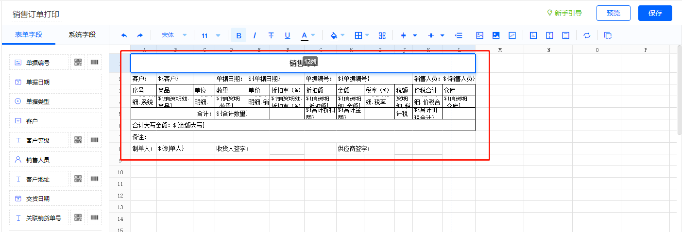 1)【销货出库明细.可用库存】、【销货出库明细.销售单价】、【销货出库明细.预估采购价】、【销货出库明细.参考成本价】、【销货出库明细.预估毛利】、【销货出库明细.预估毛利率(%)】、【销货出库明细.预估毛利率(含税)】、【销货出库明细.预估毛利(含税)】【销货出库明细.含税单价】、【销货出库明细.折扣额】、【销货出库明细.金额】、【销货出库明细.税率(%)】、【销货出库明细.税额】、【销货出库明细.价税合计】、【销货出库明细.价税合计】、【合计数量】、【合计折扣额】、【合计金额】、【合计税额】、【合计价税合计】、【优惠金额】、【优惠后金额】、【金额大写】以上字段如2.3设置公式;