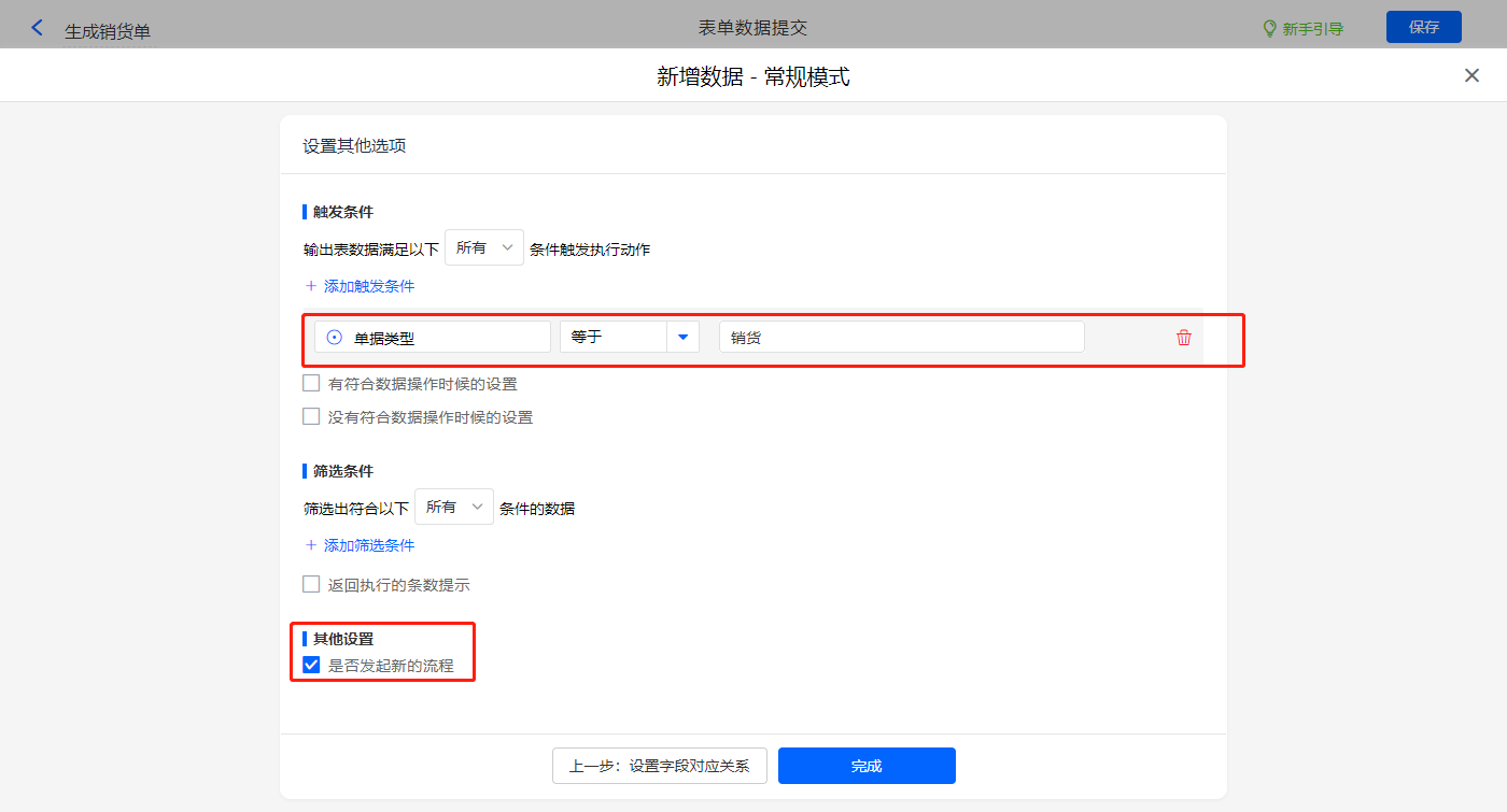 其他设置触发条件为【单据类型】字段等于销货,并设置发起新流程,设置好点击【完成】并保存该数据助手;