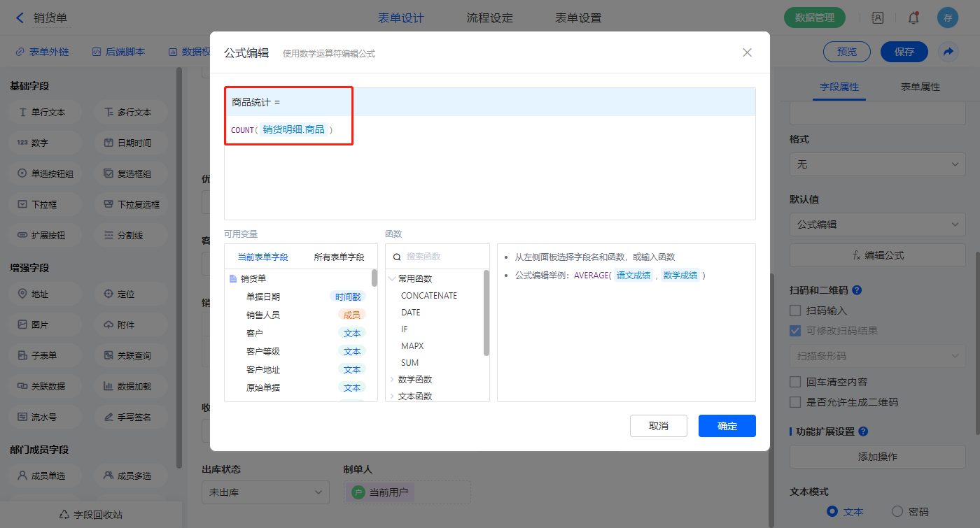 选择【商品统计】字段,设置默认值为公式编辑,如图设置公式;