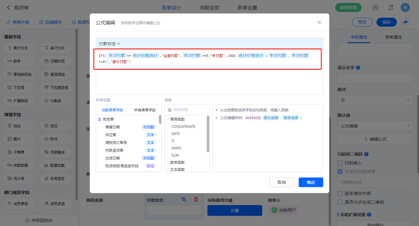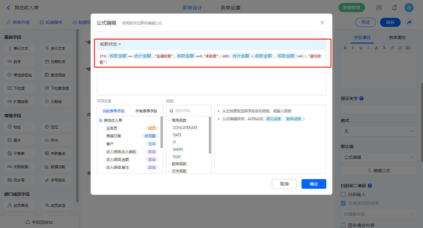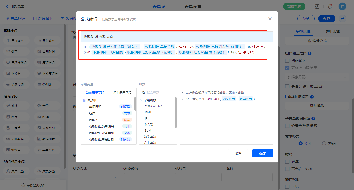 选择【收款状态】字段,设置默认值为公式编辑,设置公式:“IFS(本次收款合计价税合计,"全部收款",本次收款0,"未收款",(AND(合计价税合计>本次收款,本次收款!=0)),"部分收款")”;