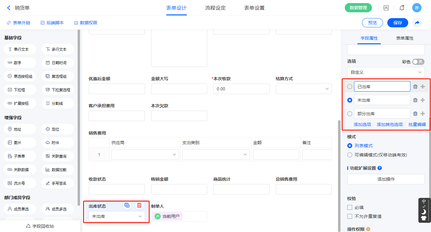2)选择【出库状态】字段,输入下拉框选择,并设置默认值为未出库;
