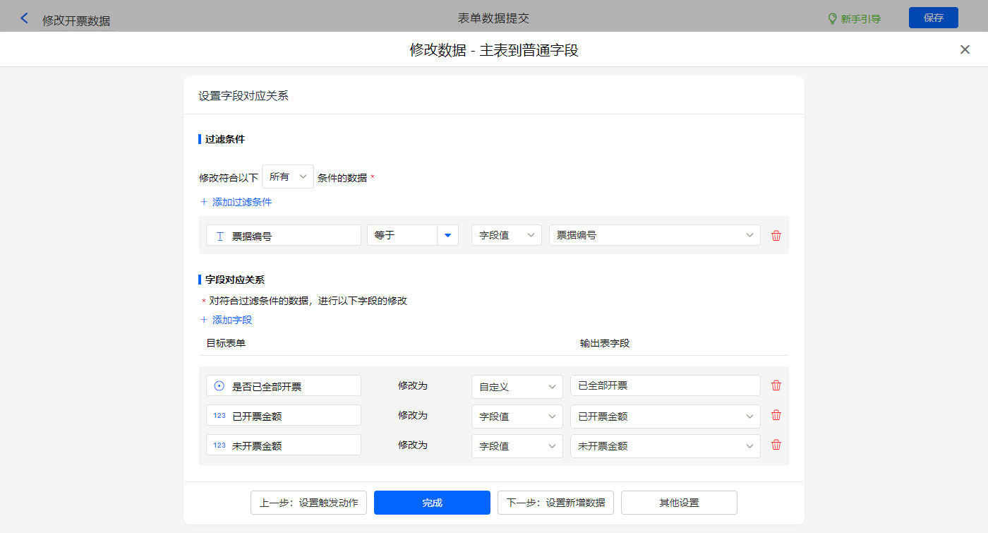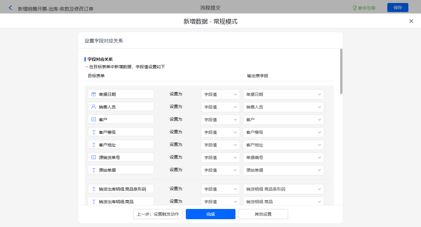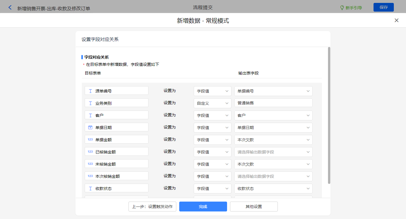 新增销售开票-出库-收款及修改订单的数据助手,有四个执行动;新增新增数据的执行动作,选择目标表单【销售开票】,选择对应字段,设置好点击【完成】并保存该数据助手;