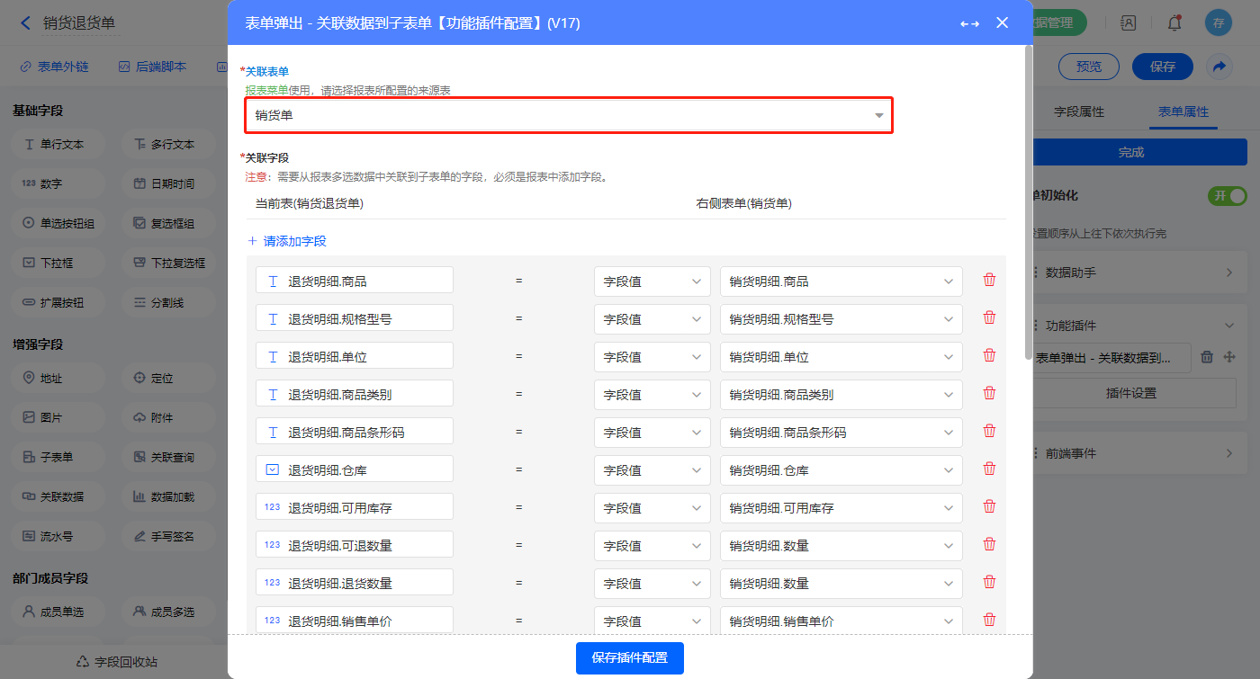 选择关联表单为表单【销货单】,添加该表的子表单字段对应表单的字段,设置完成点击【保存模块设置】;