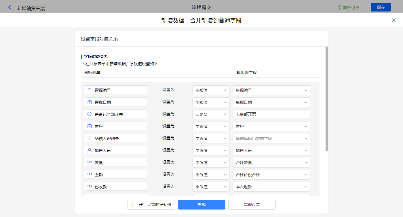 新增销货开票的数据助手,新增新增数据的执行动作,选择目标表单【销售开票】,选择对应字段,设置好点击【完成】并保存该数据助手;
