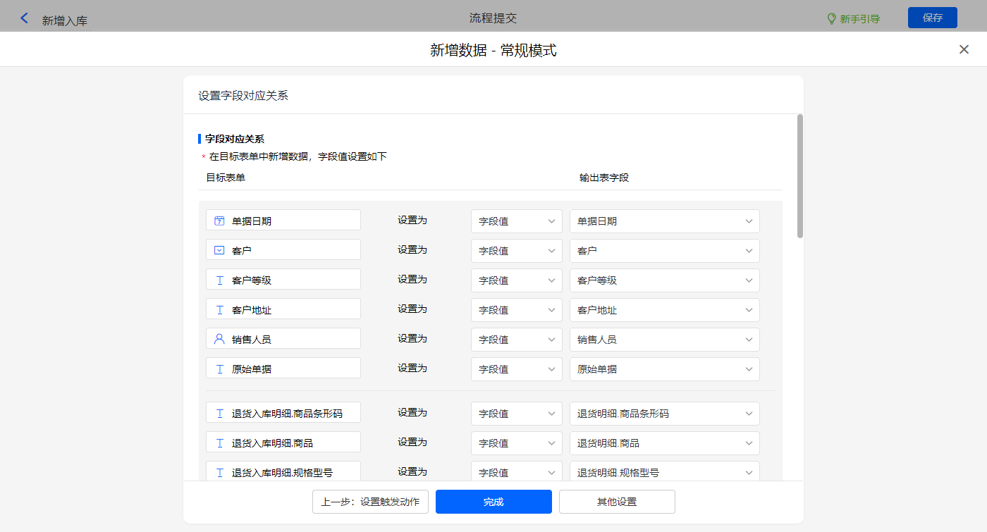 其他设置触发条件为【单据类型】字段等于退货,并设置发起新流程,设置好点击【完成】并保存该数据助手;