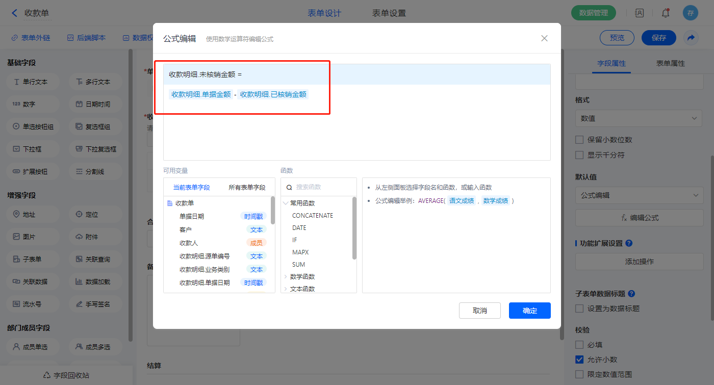 【收款金额】字段默认值设置为公式编辑,如图设置公式;