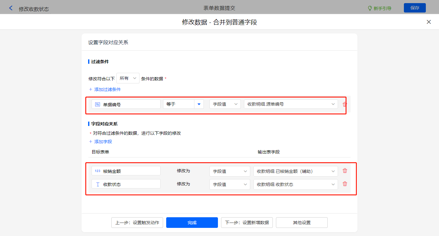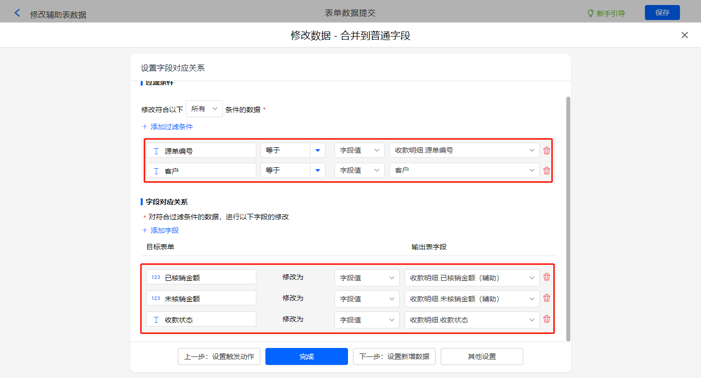 修改辅助表数据的数据助手,新增修改数据的执行动作,选择修改【收款单辅助表】表单,选择对应过滤条件,以及需要修改的字段,设置好点击【完成】并保存该数据助手;