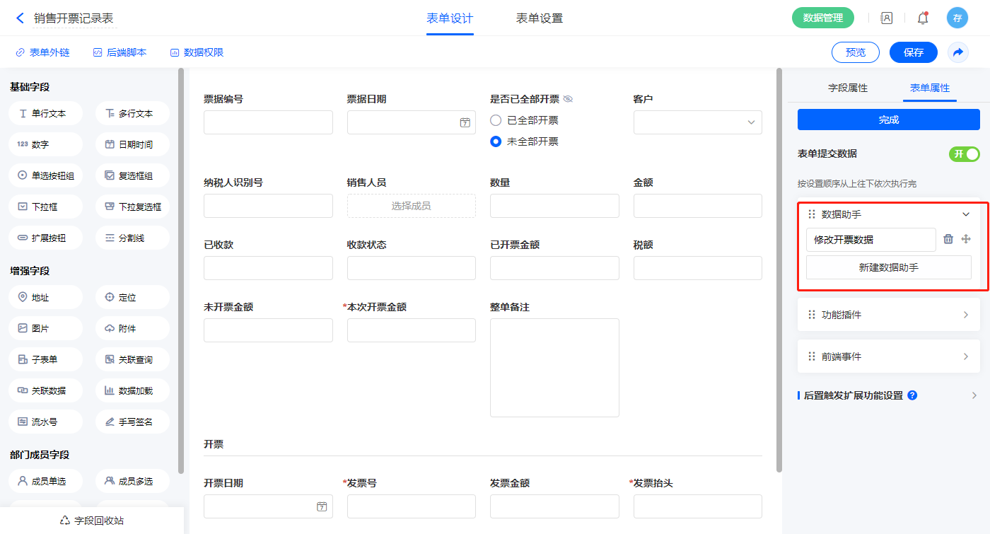 1)表单提交数据新增一条数据助手,名称为修改开票数据;